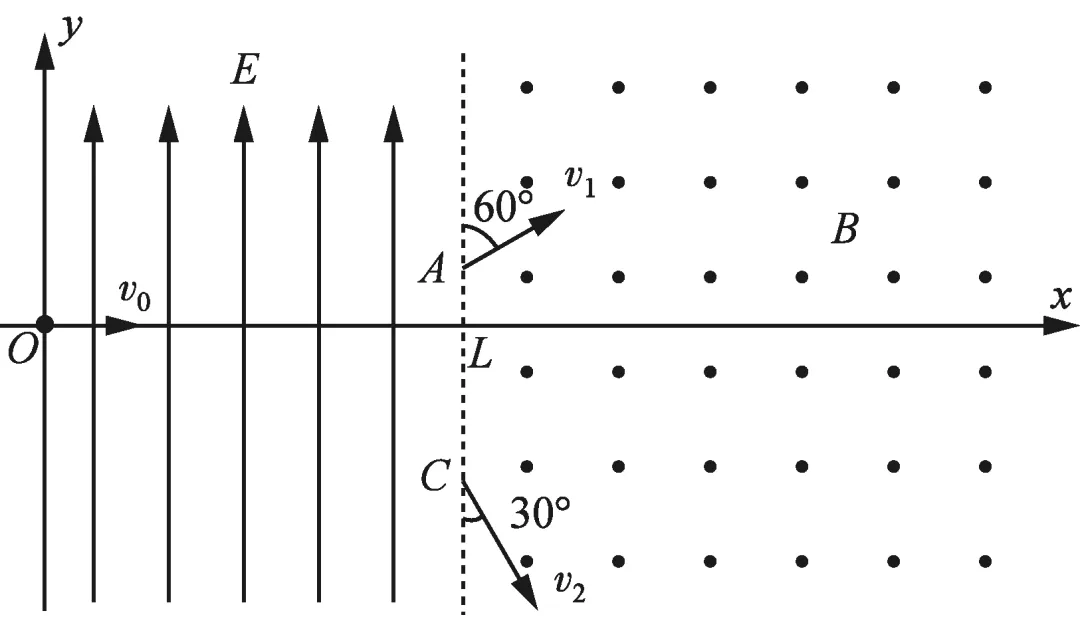 1. 如图所示,在xOy平面内,0<x<L的区域内有一沿y轴正方向的匀强电场.x>L的区域内有一方向垂直于xOy平面向外的匀强磁场.某时刻,一带正电的粒子从坐标原点以沿x轴正方向的初速度v0进入电场,之后的某一时刻,另一带等量负电的粒子以同样的初速度从坐标原点进入电场.正、负粒子从电场进入磁场时速度方向与电场和磁场边界的夹角分别为60°和30°,两粒子在磁场中分别运动半周后在某点相遇.两粒子的重力以及两粒子之间的相互作用都可忽略不计.求: