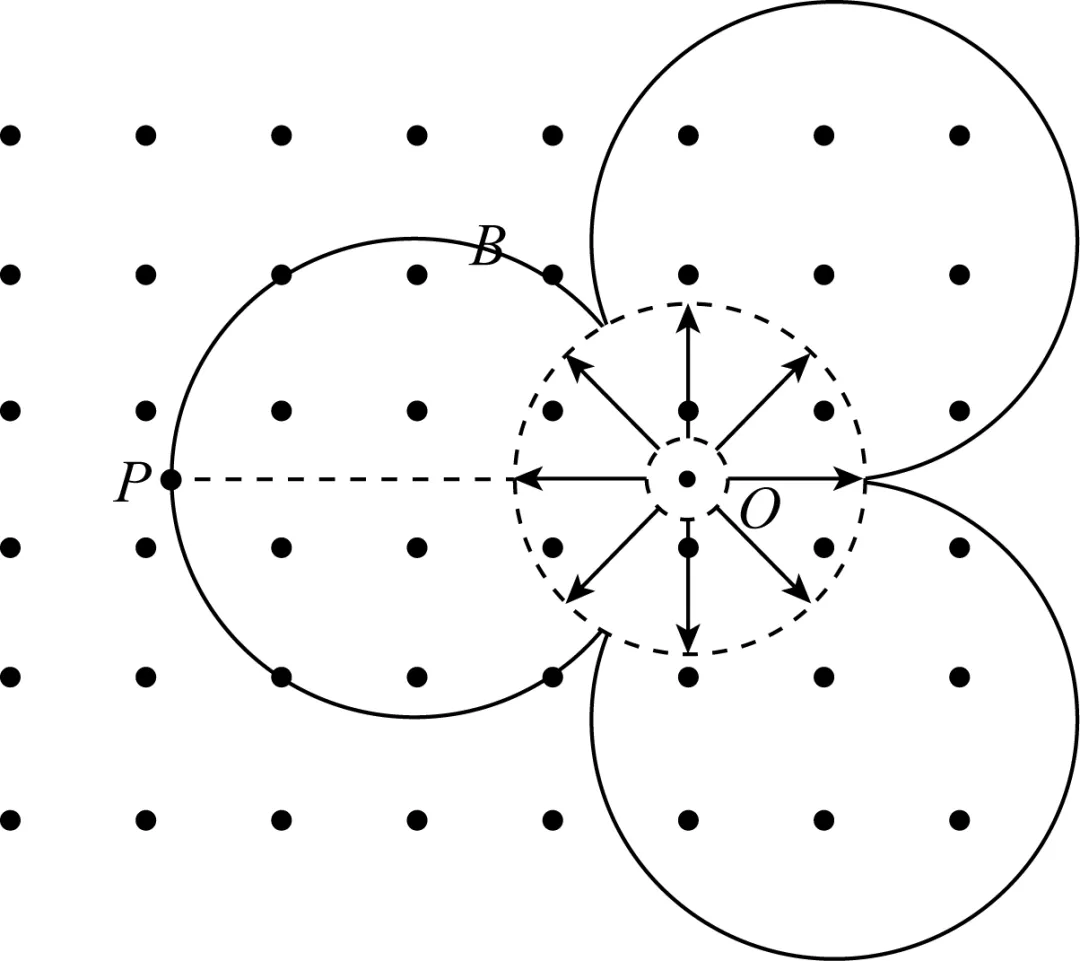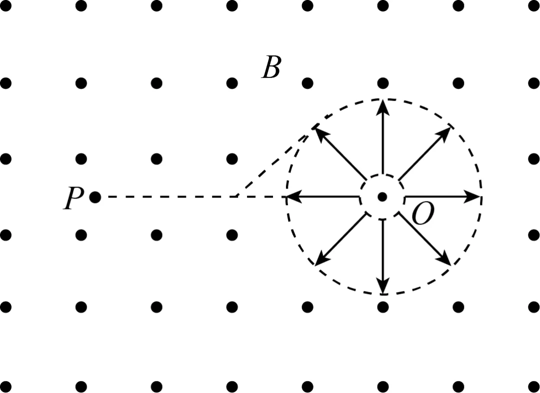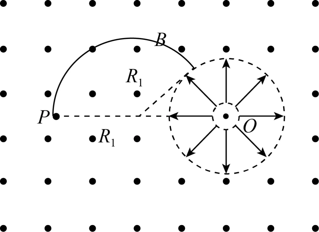 2. (2025·镇江期初)如图所示,在P点有一粒子源可发射质量为m、电荷量为q(q>0)的粒子.以O为圆心有一大圆与小圆,大圆半径为r,大圆外存在方向垂直纸面向外的匀强磁场,磁感应强度大小为B,大圆与小圆之间的区域存在方向沿半径向外的辐向电场,不计粒子重力.