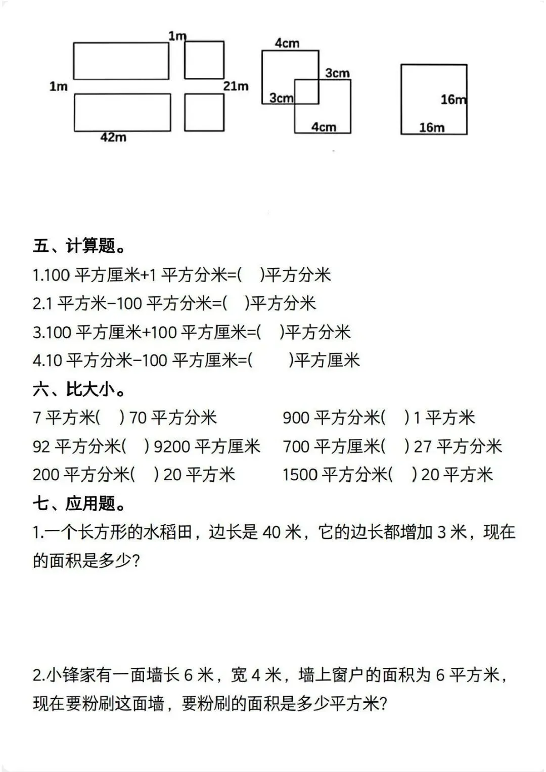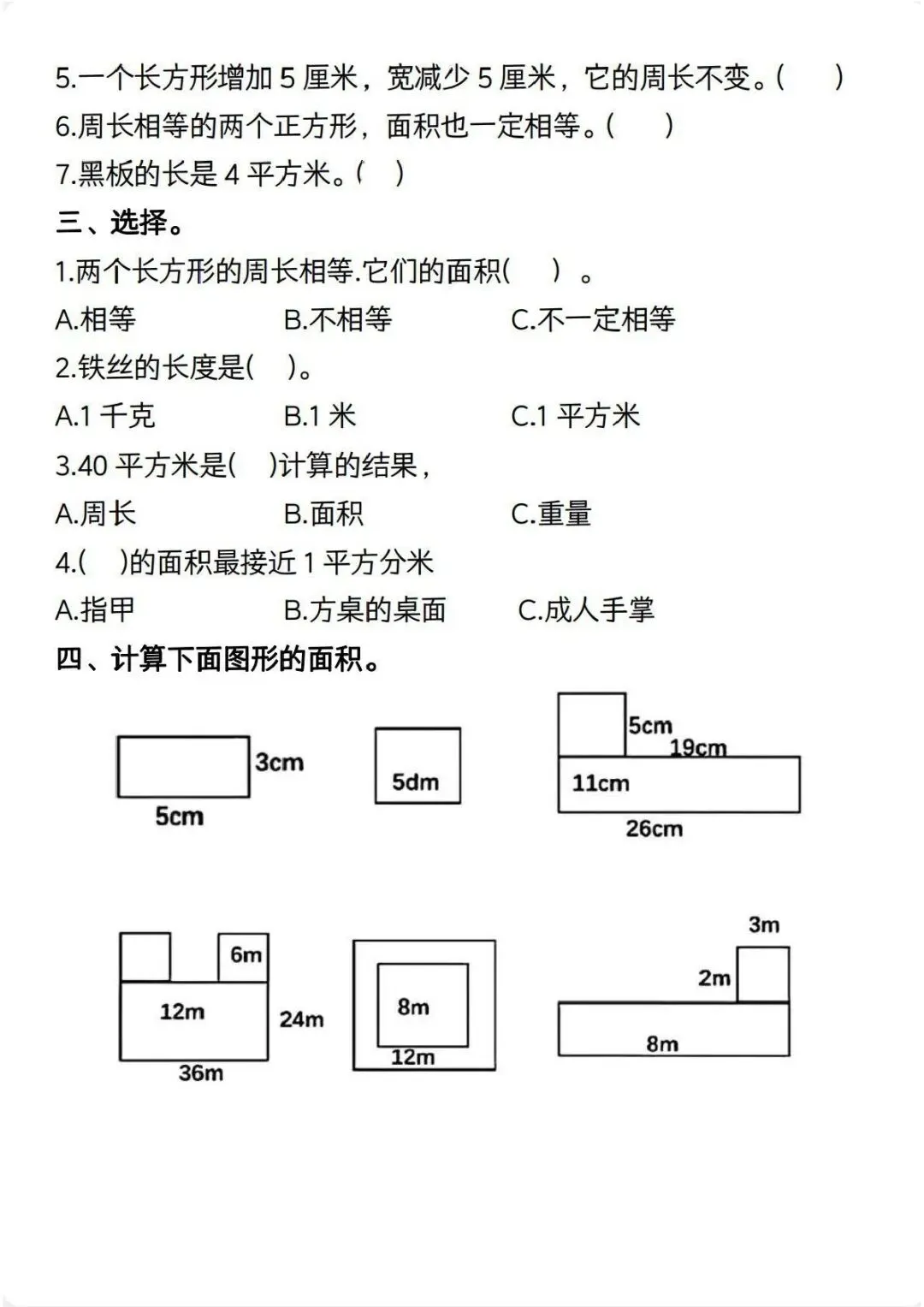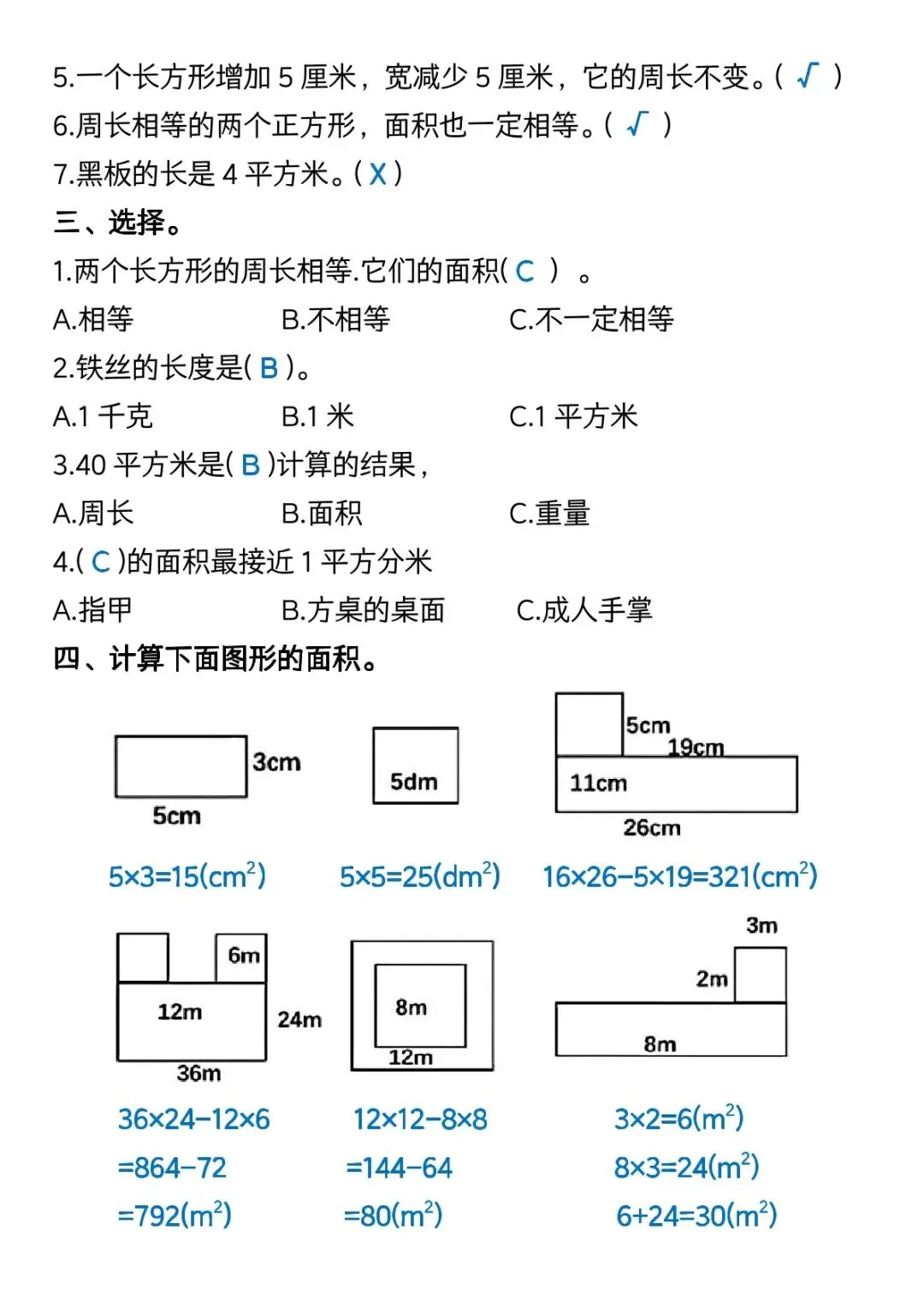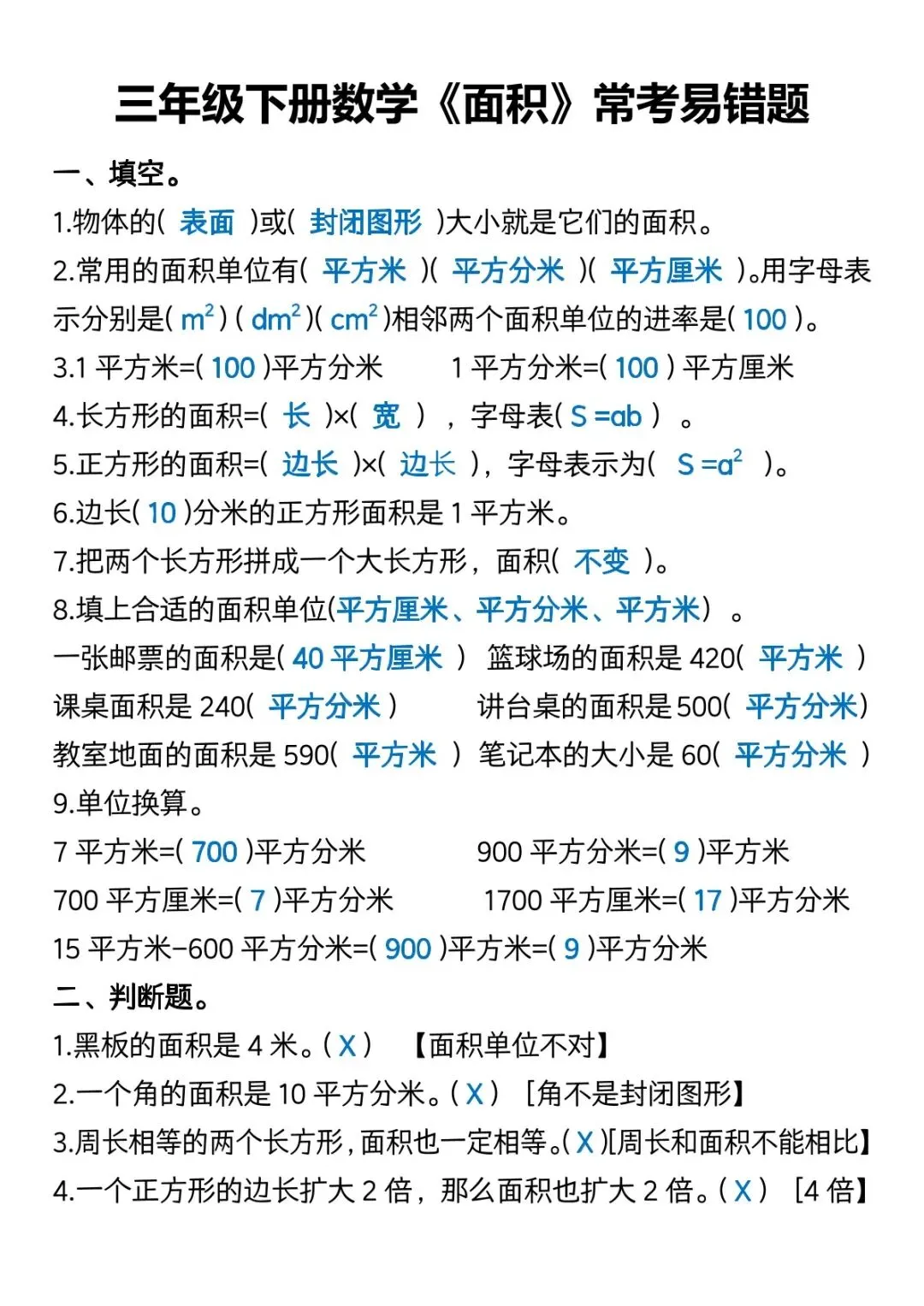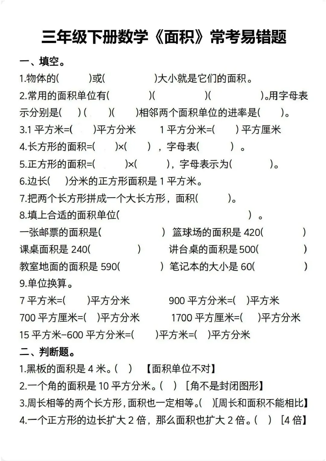 可下载丨26春三年级下册数学【面积】常考易错题,电子版可打印