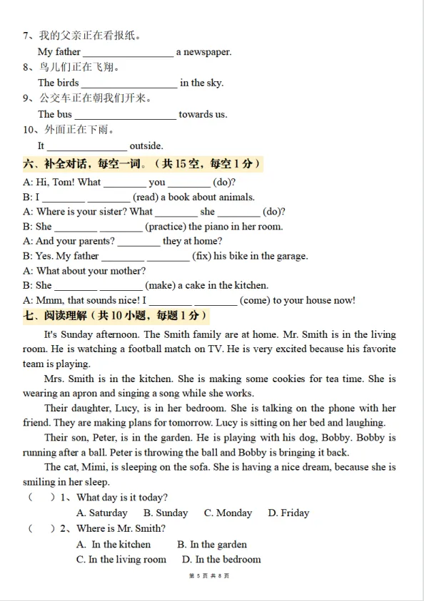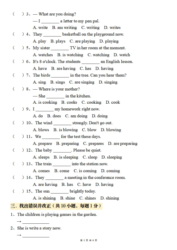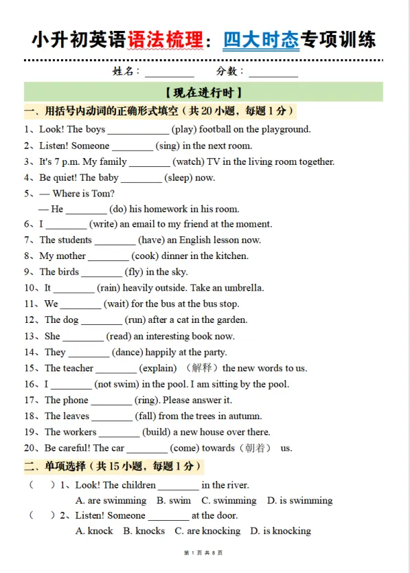 小升初六年级英语下册(通用版)英语语法梳理:四大时态专项训练(现在进行时)(含答案,可打印)