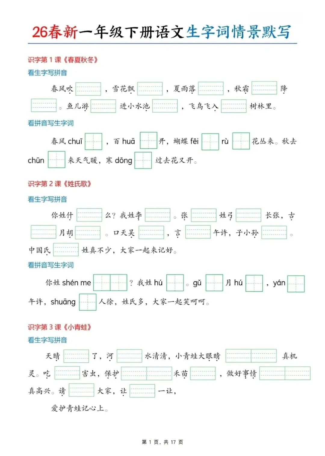 这份一年级下册语文《生字词情景默写》,情景化巧记字词,告别枯燥背诵,让孩子学懂会用,字词基础稳稳扎根💯