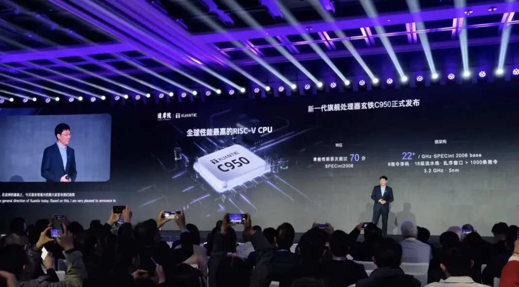 阿里达摩院推出新一代旗舰RISC-V CPU IP——玄铁C950,SPECint2006基准测试突破70分,成为全球最强RISC-V CPU。产品首次实现RISC-V CPU原生流畅跑通千亿参数大模型(Qwen3、DeepSeek V3),集成4K超宽Vector引擎和Matrix引擎,单核算力达8TFLOPS。