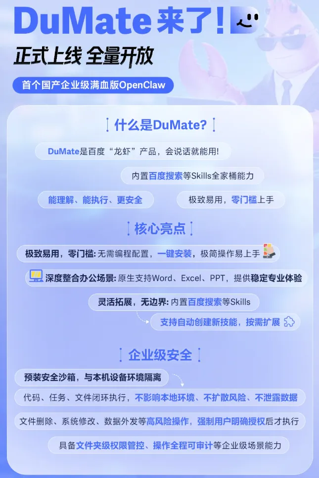 百度智能云DuMate(中文名:搭子)正式上线,成为国内首个企业级满血版OpenClaw产品。产品用自然语言为交互入口,支持Word、Excel、PPT等办公软件的原生操作,具备文件智能管理、多源数据分析、办公操作自动化三大核心功能。DuMate内置百度搜索等Skills全家桶能力,支持灵活扩展。
