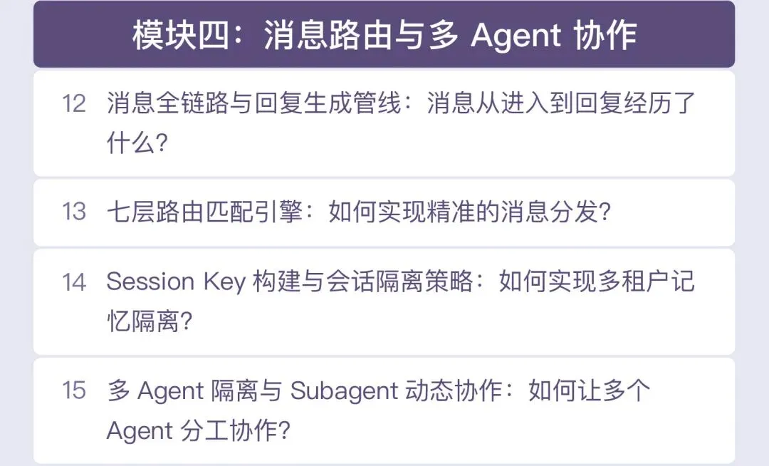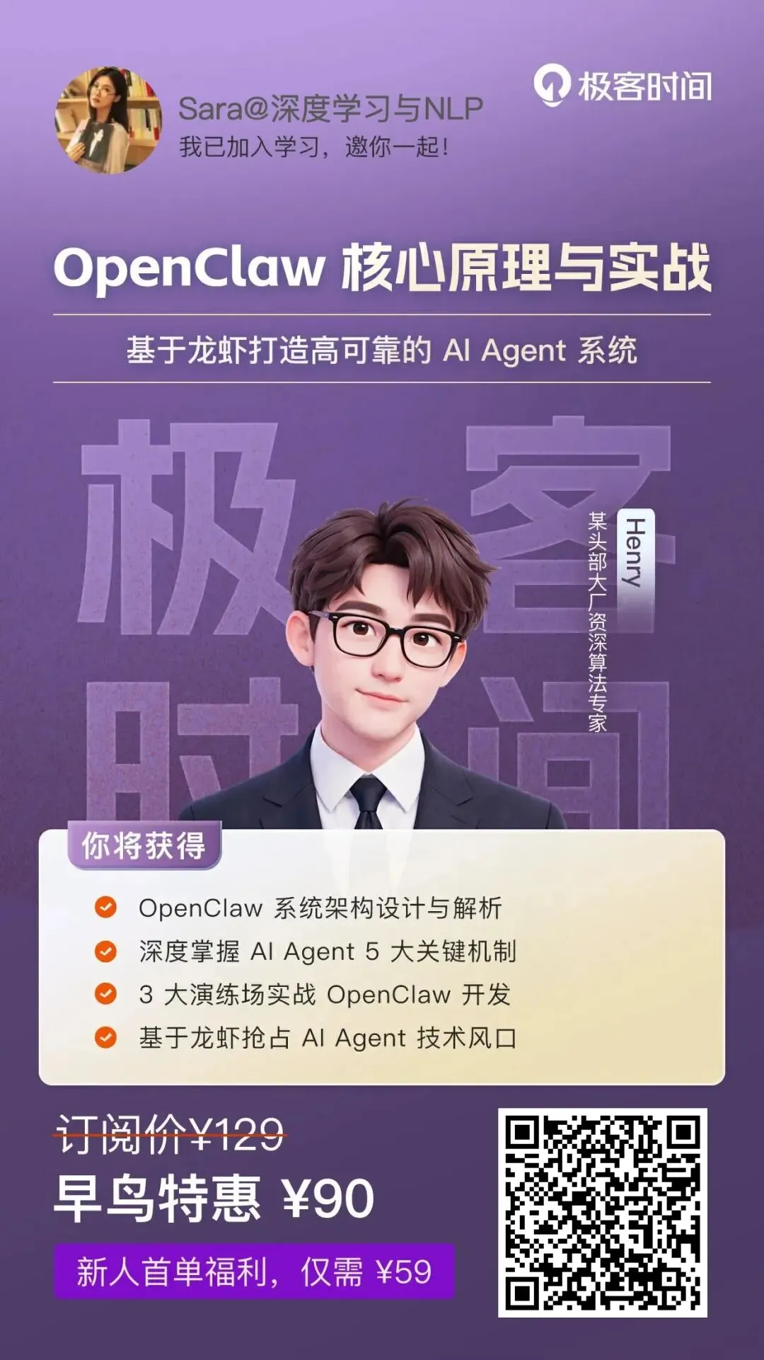 当你学完这门课,脑中会建立起一套以 OpenClaw 为代表的完整 Agent 系统设计认知框架。以后无论面对哪个新框架、新协议、新架构,你都能快速理解它的设计意图,评估它的工程取舍,甚至参与到它的建设中去。