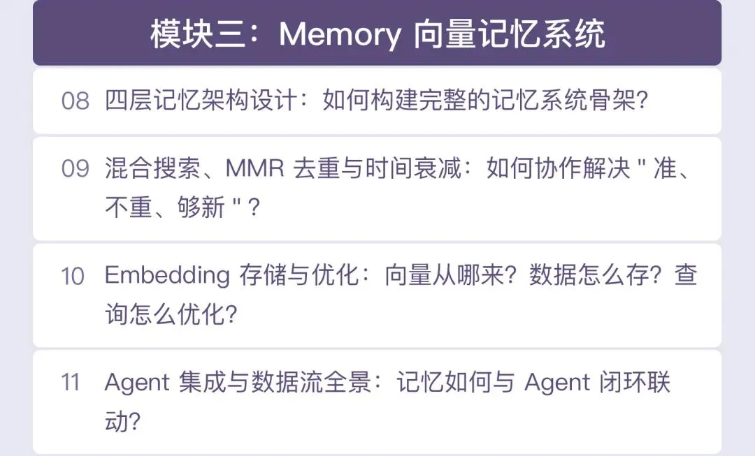 尤其是“Agent 集成与数据流全量”这一节,讲的是记忆怎么跟 Agent 的日常运行联动起来。很多 Agent 不是没有记忆,是记忆用不对地方,这节正好在讲怎么解决这个问题。