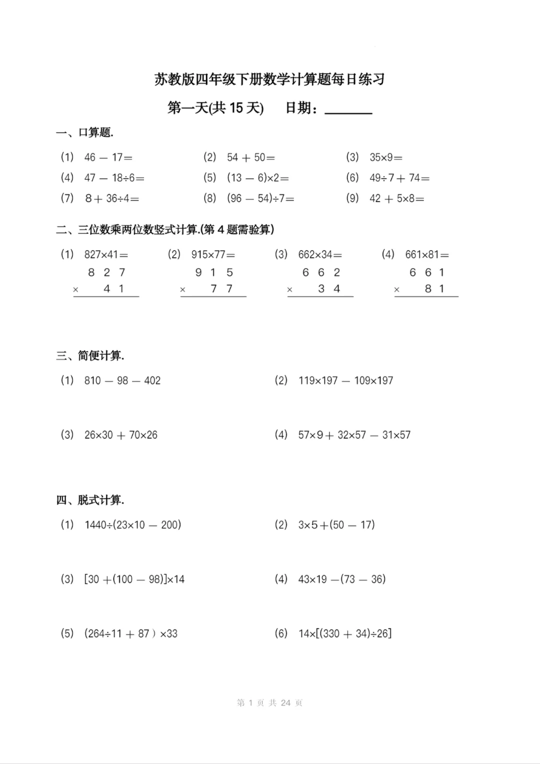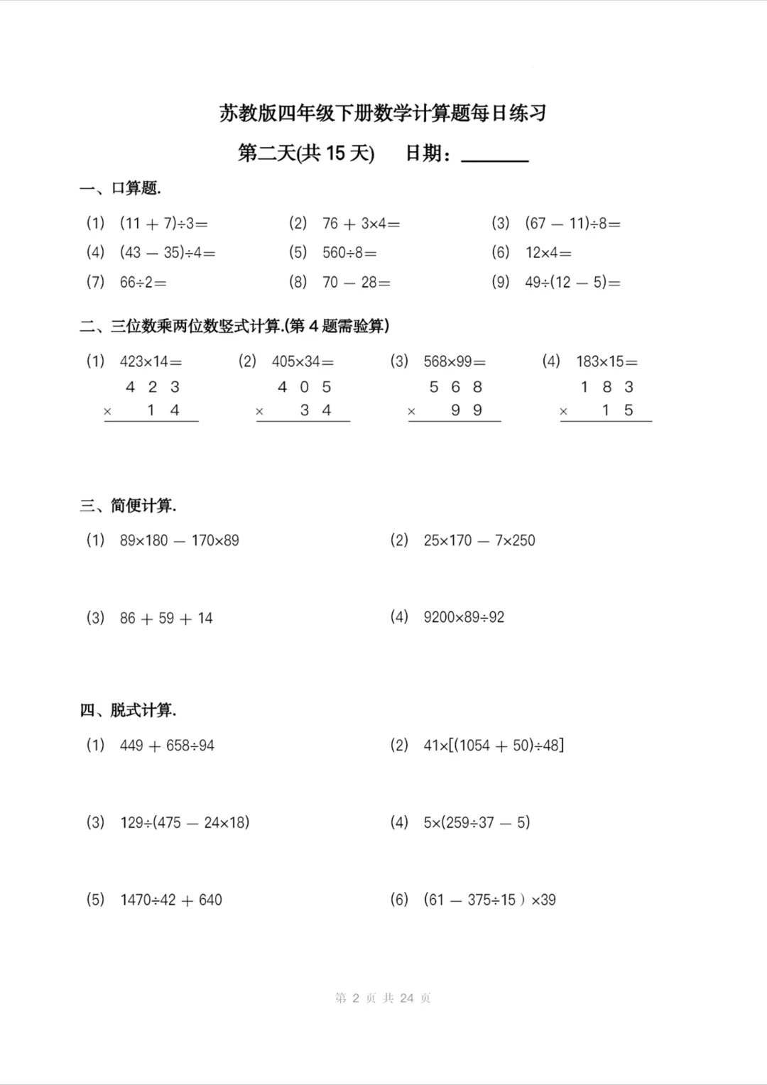 【高清电子版】四(下)数学(苏教版)计算题每日练习