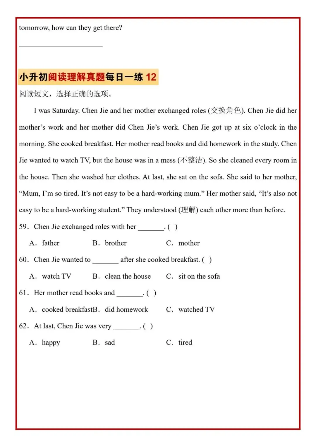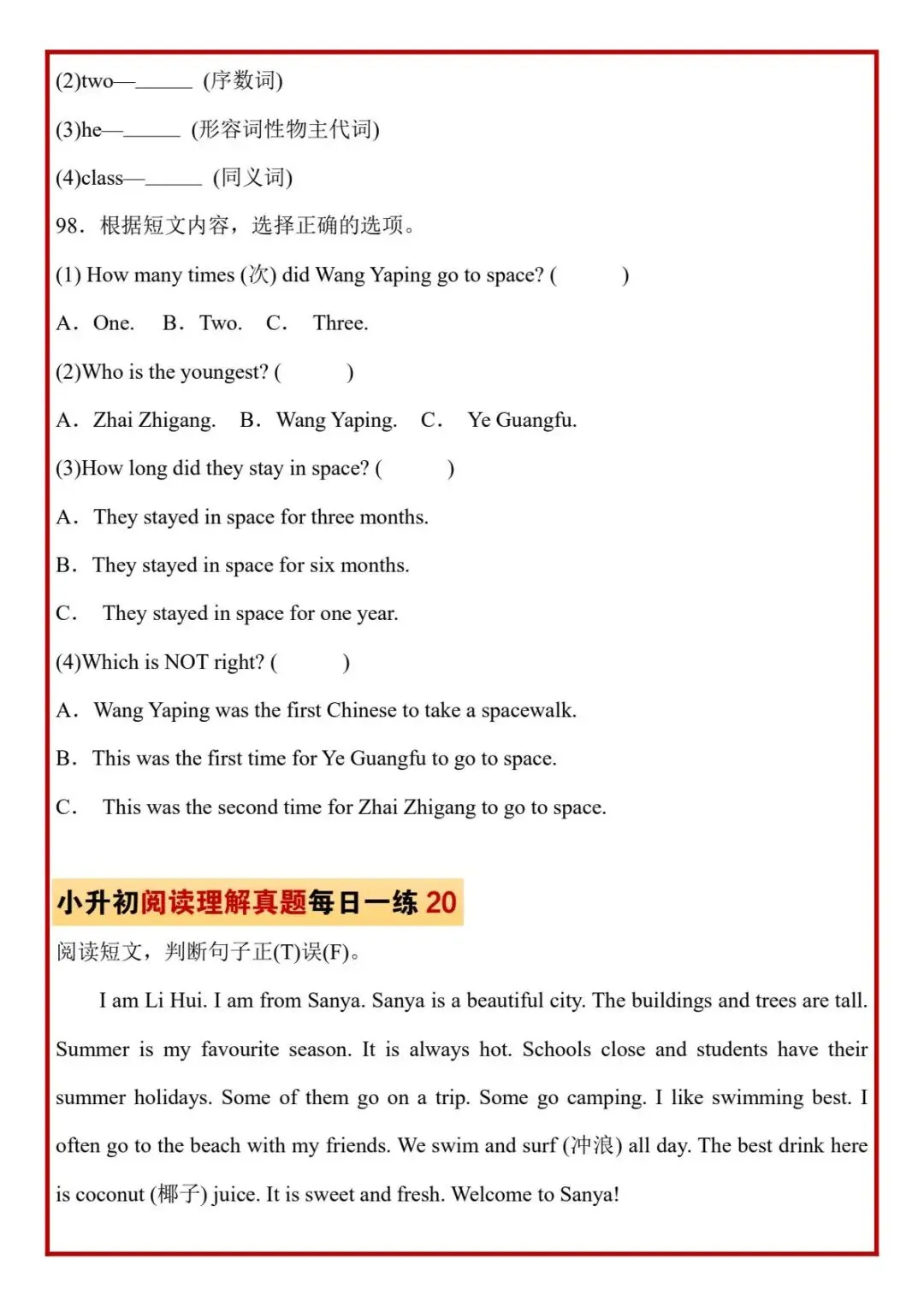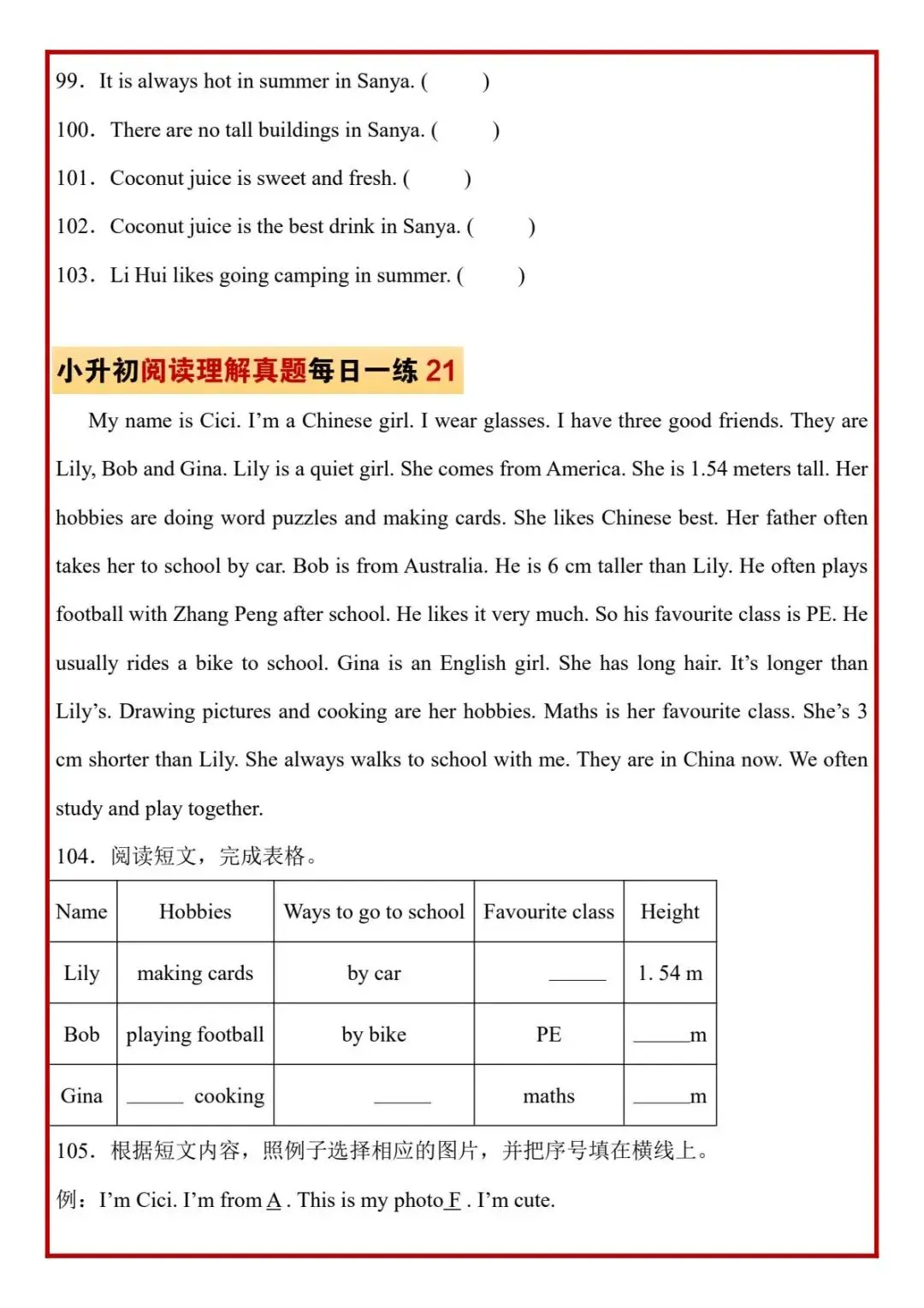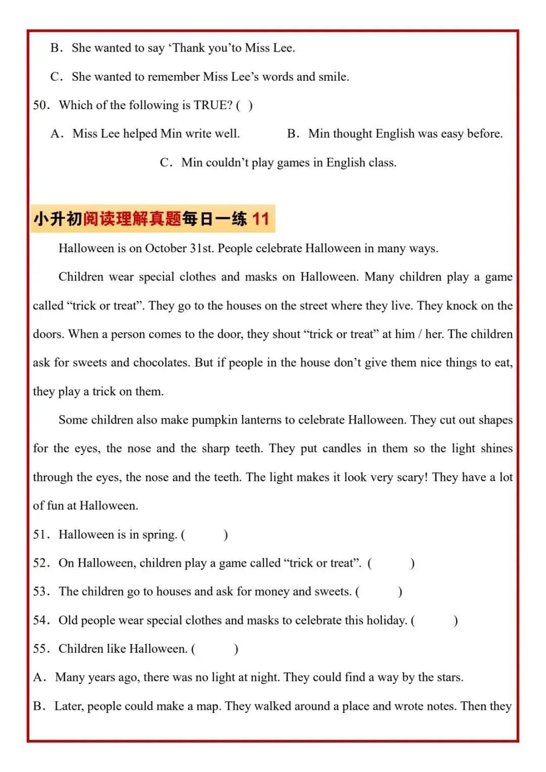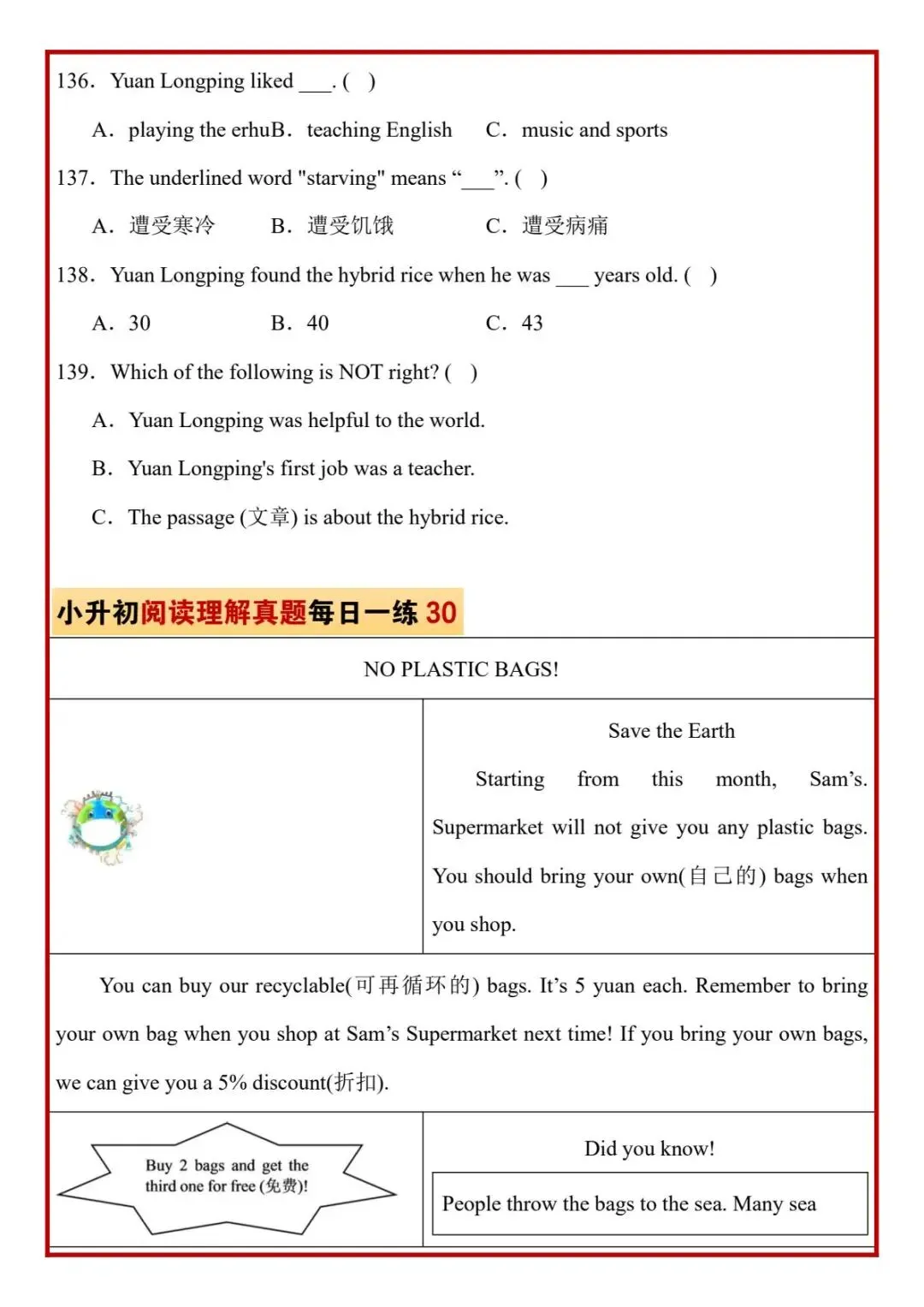 今日分享六年级下册英语人教版PEP版《小升初阅读理解真题每日一练题》,需要的家长抓紧打印出来,让孩子在每天练一练吧。