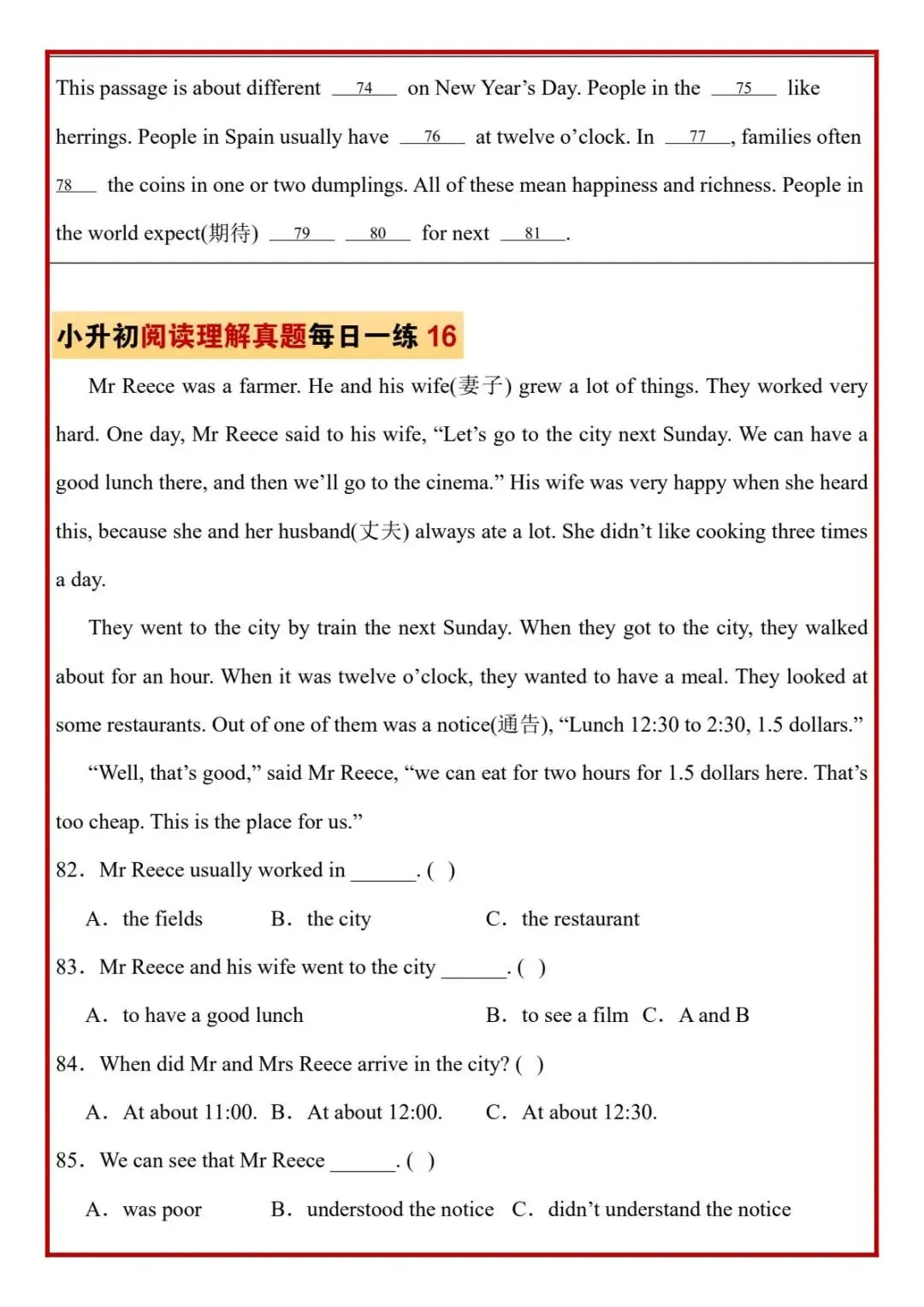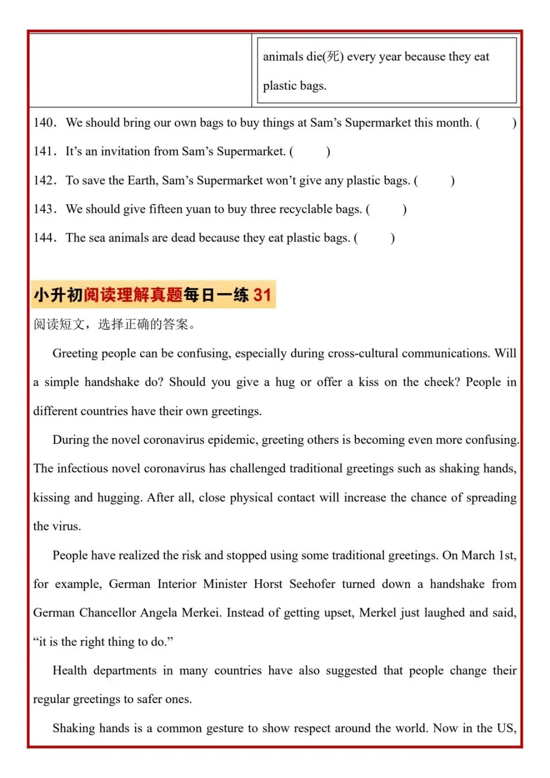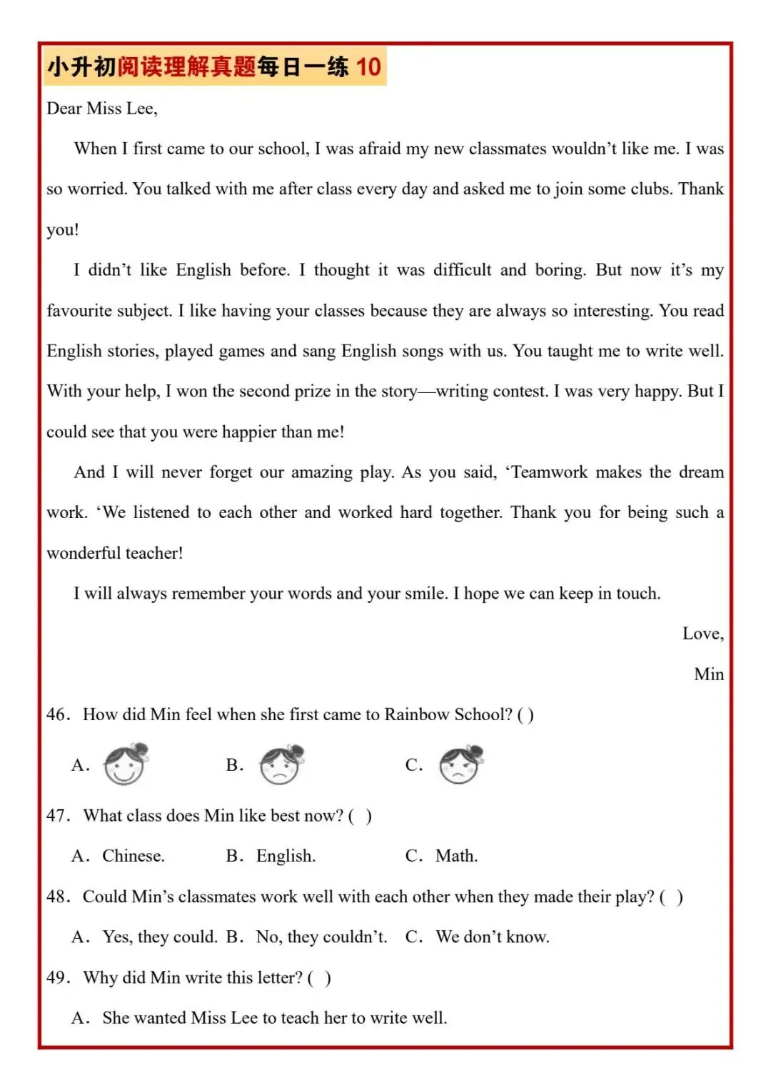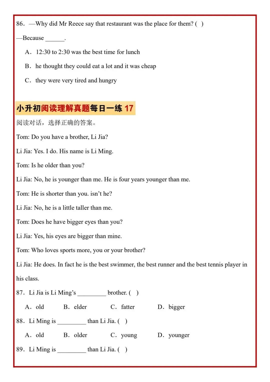 今日分享六年级下册英语人教版PEP版《小升初阅读理解真题每日一练题》,需要的家长抓紧打印出来,让孩子在每天练一练吧。