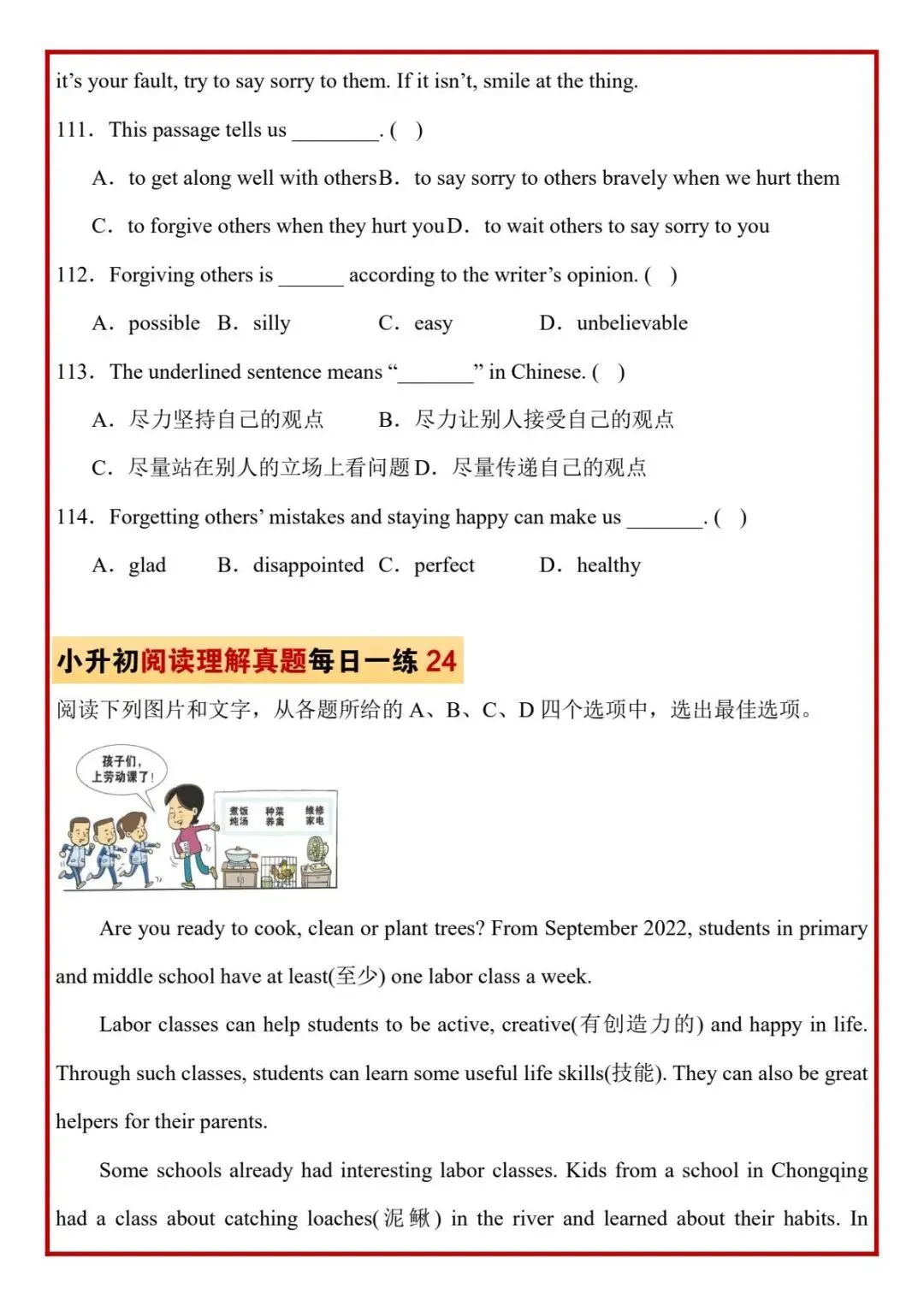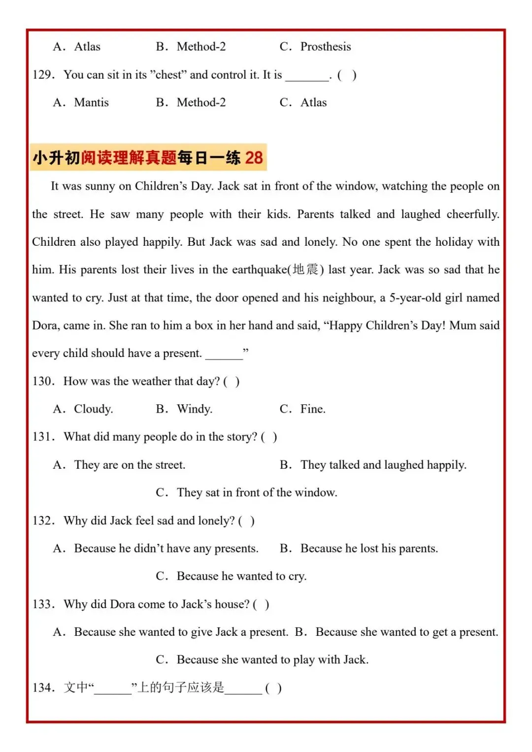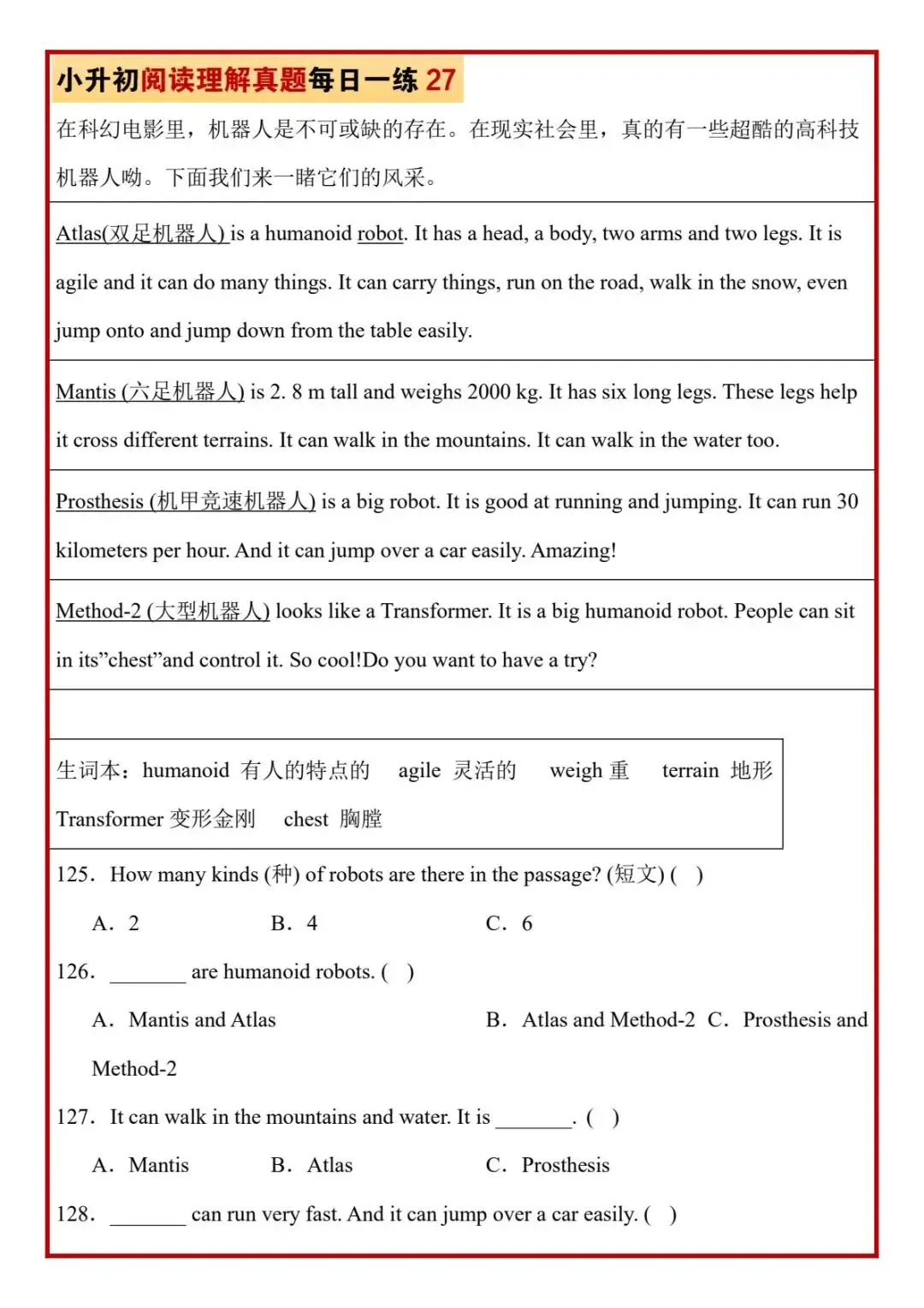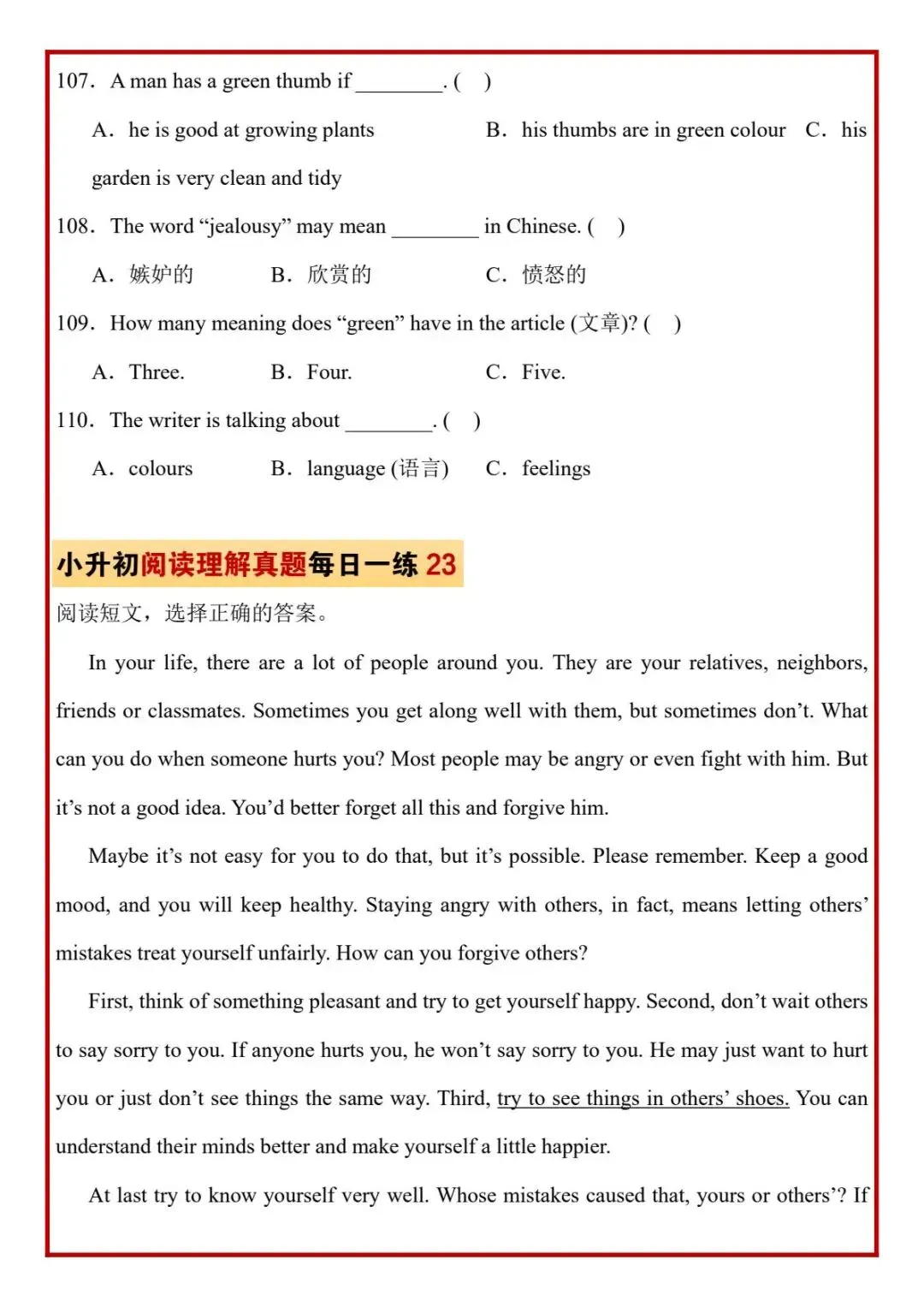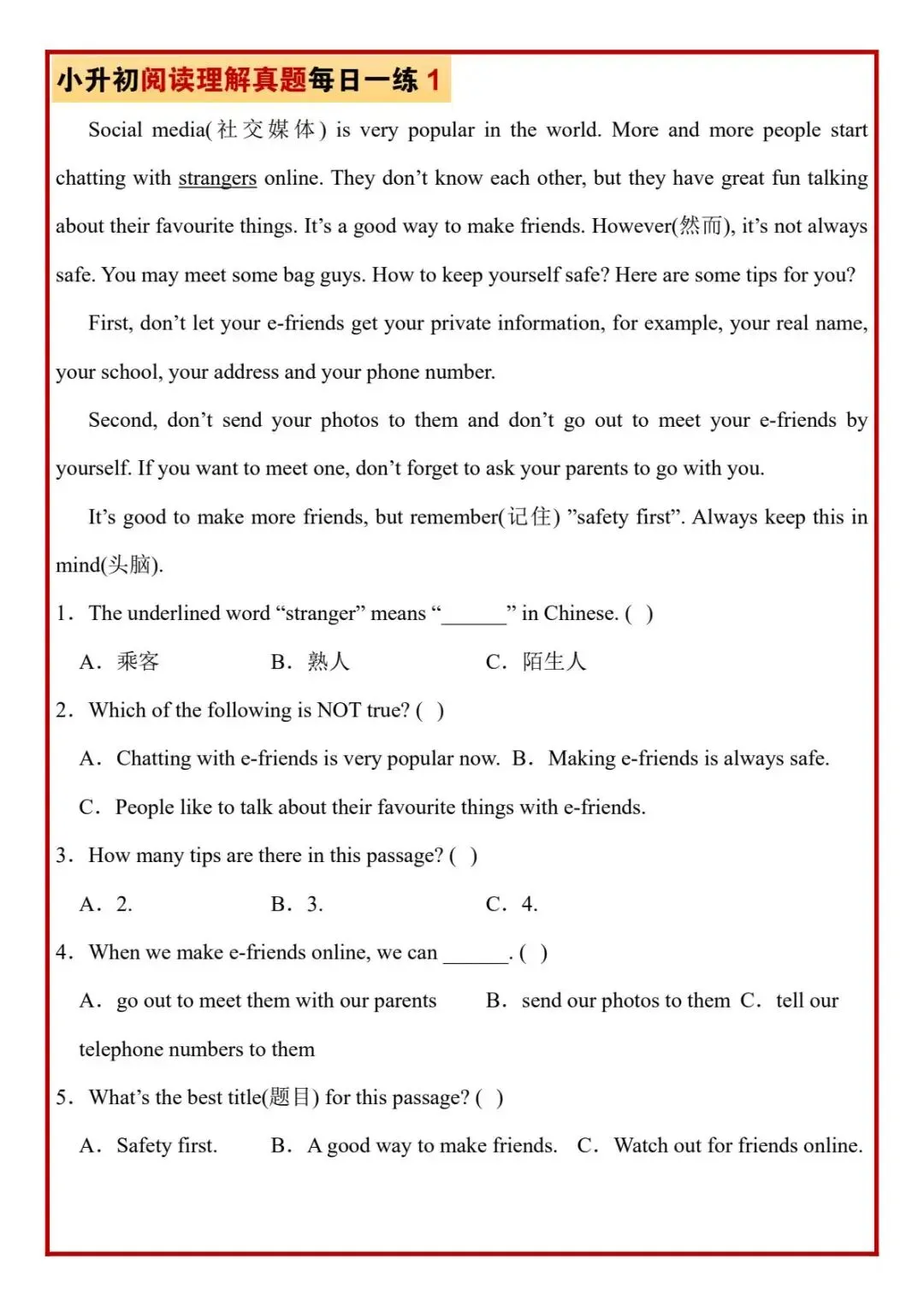 今日分享六年级下册英语人教版PEP版《小升初阅读理解真题每日一练题》,需要的家长抓紧打印出来,让孩子在每天练一练吧。