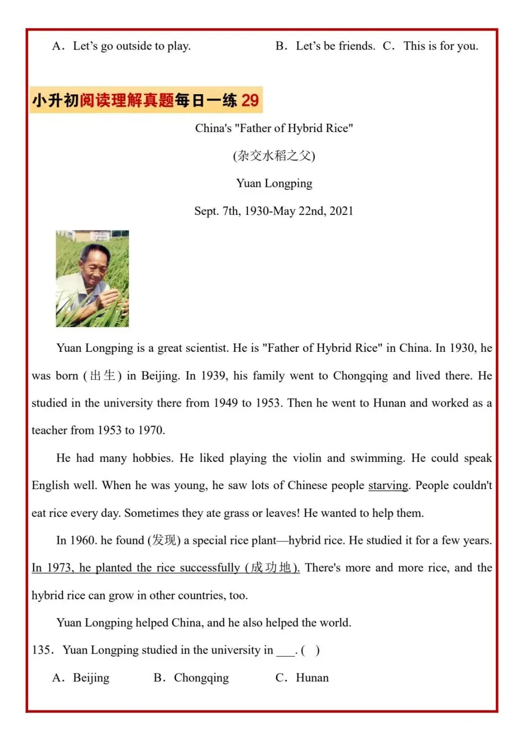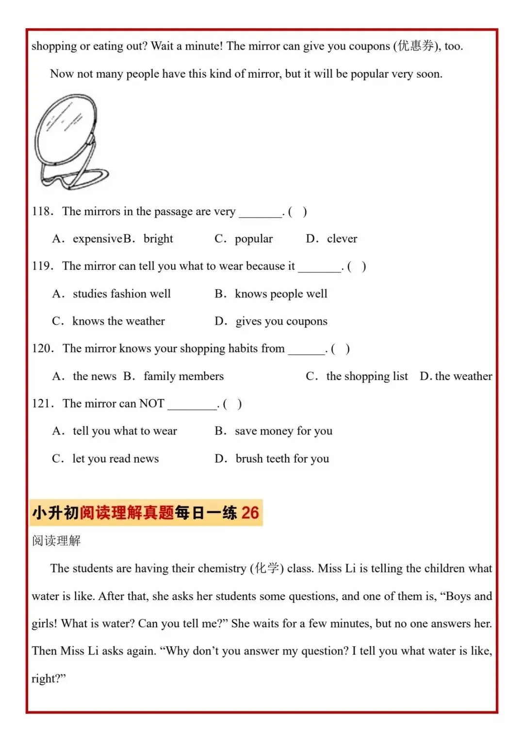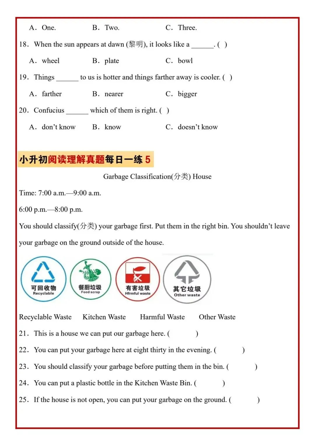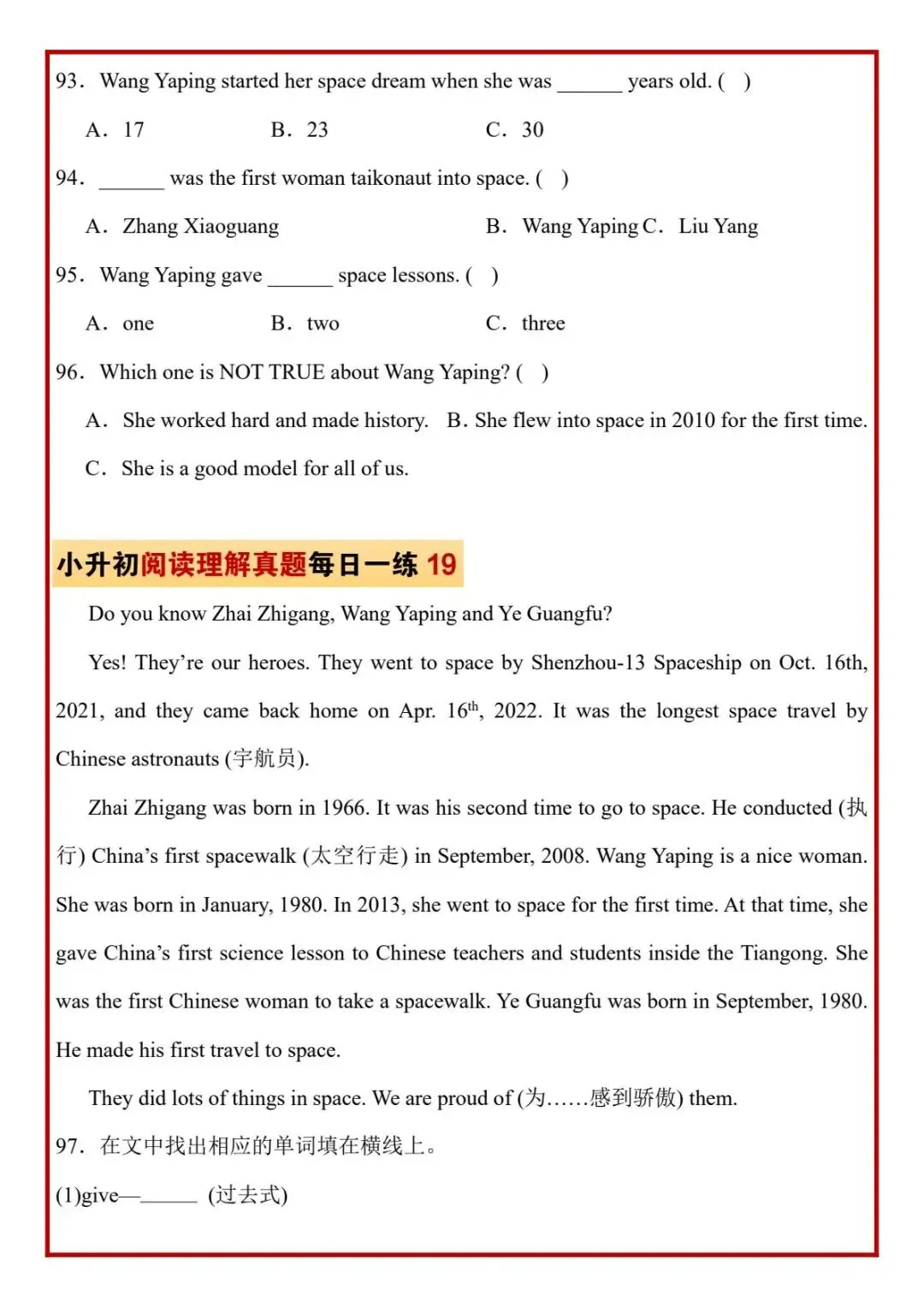 今日分享六年级下册英语人教版PEP版《小升初阅读理解真题每日一练题》,需要的家长抓紧打印出来,让孩子在每天练一练吧。