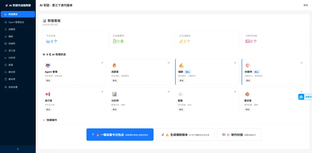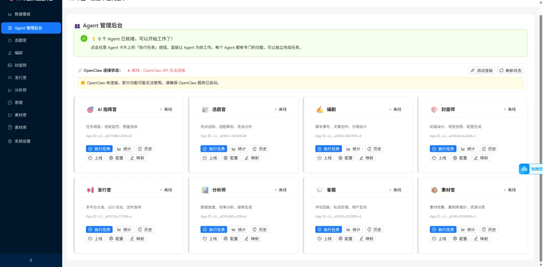 选题官监控热搜→ 选题库 P0/P1/P2 分级→ 指挥官拆解任务→ 编剧出脚本→ 分析师审数据→ 发行官多平台分发→ 客服跟进互动→ 分析师复盘 ROI → 优化下一轮