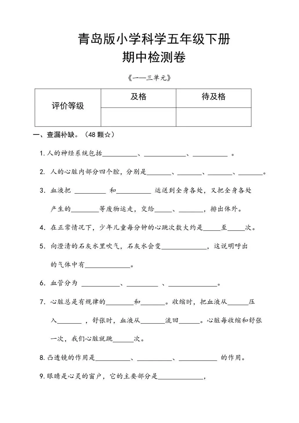 家长们看过来!青岛六三制5年级下册科学期中测试卷重磅来袭!试卷紧密贴合高频搜索考点,精准覆盖重难点知识。电子版方便打印,还附带详细答案,让孩子在家就能自测,及时查漏补缺,为期中成绩提升助力!速来公众号免费领取。