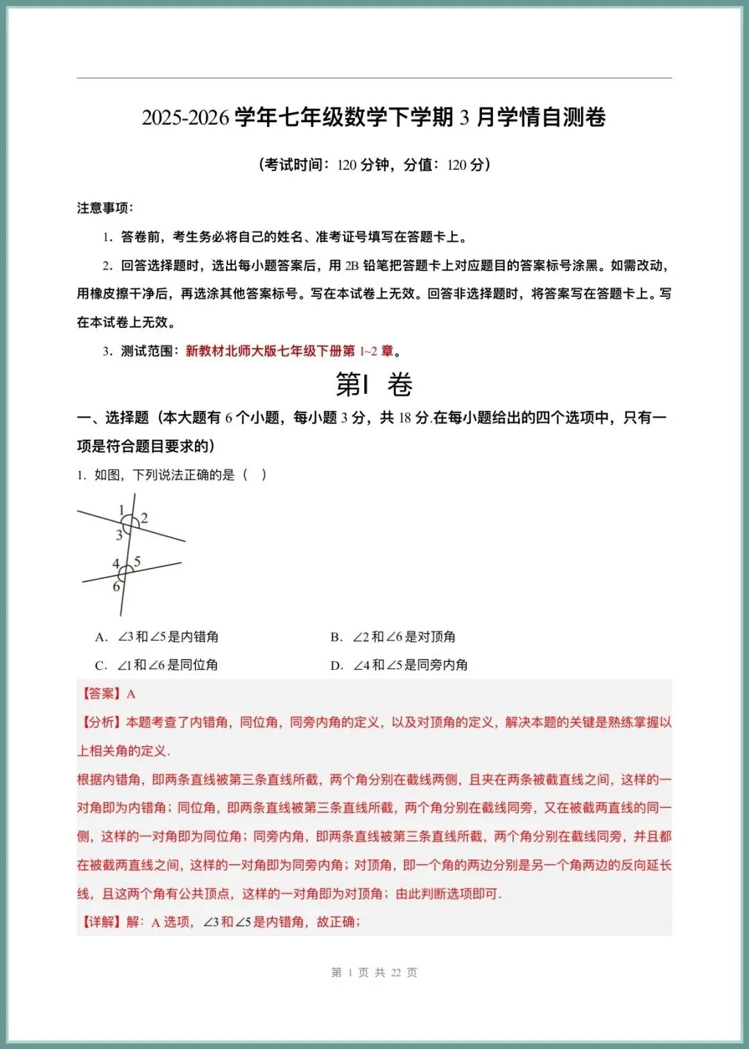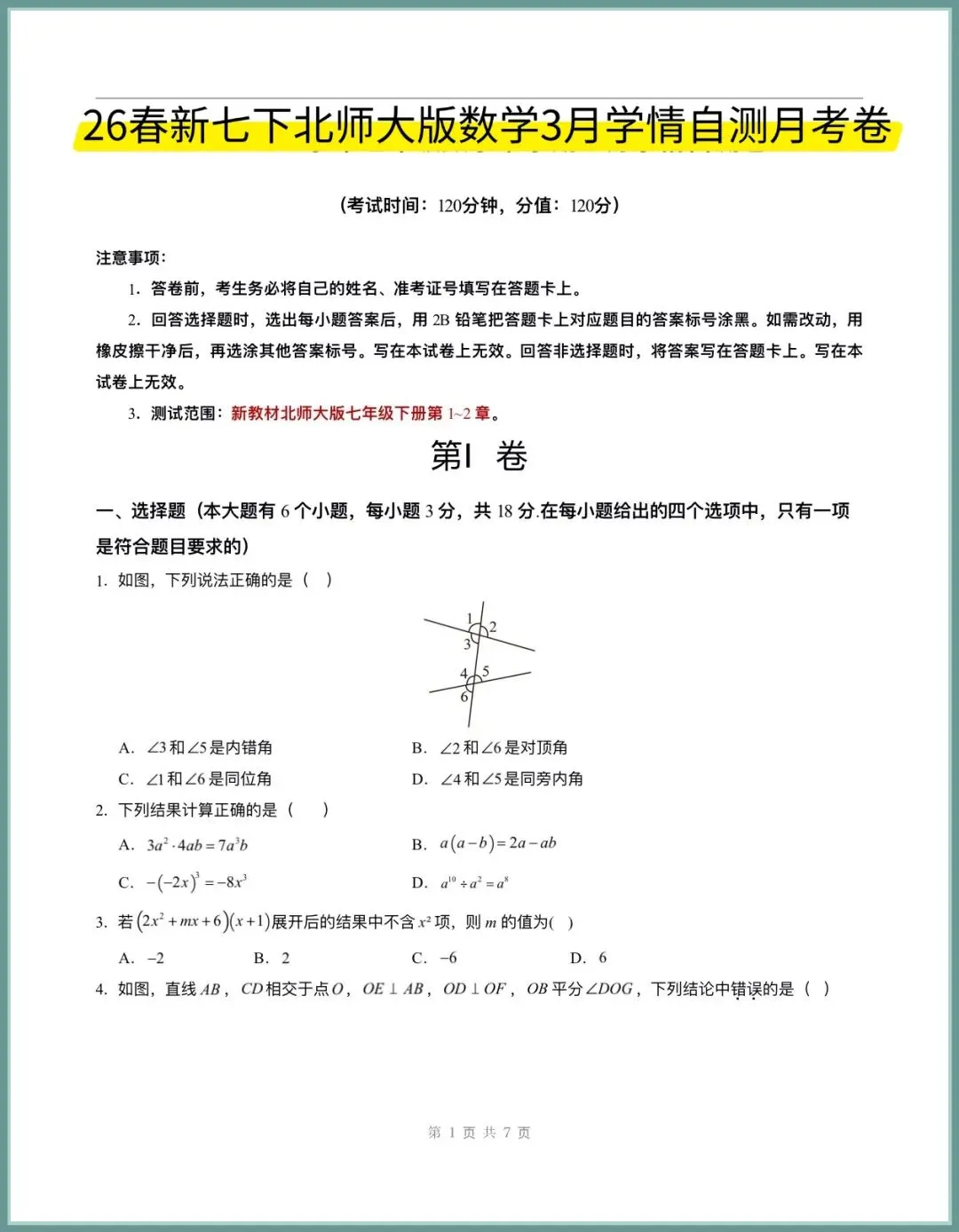 🌟2026春新北师大版七年级下册数学3月第一次月考卷(附答案),完整电子版可下载打印