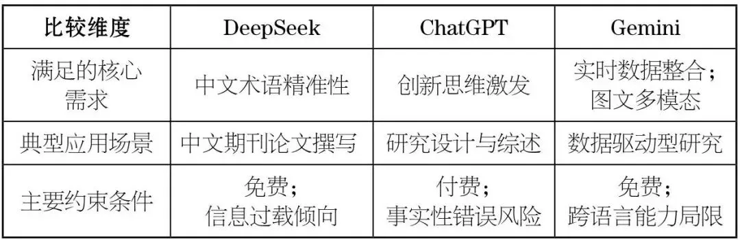 在适用场景方面,DeepSeek更适用于面向中文期刊发表等中文学术写作目的;ChatGPT则在研究设计与综述上具有较好的表现;而Gemini则更适用于需要生成大量图像的数据驱动型研究。