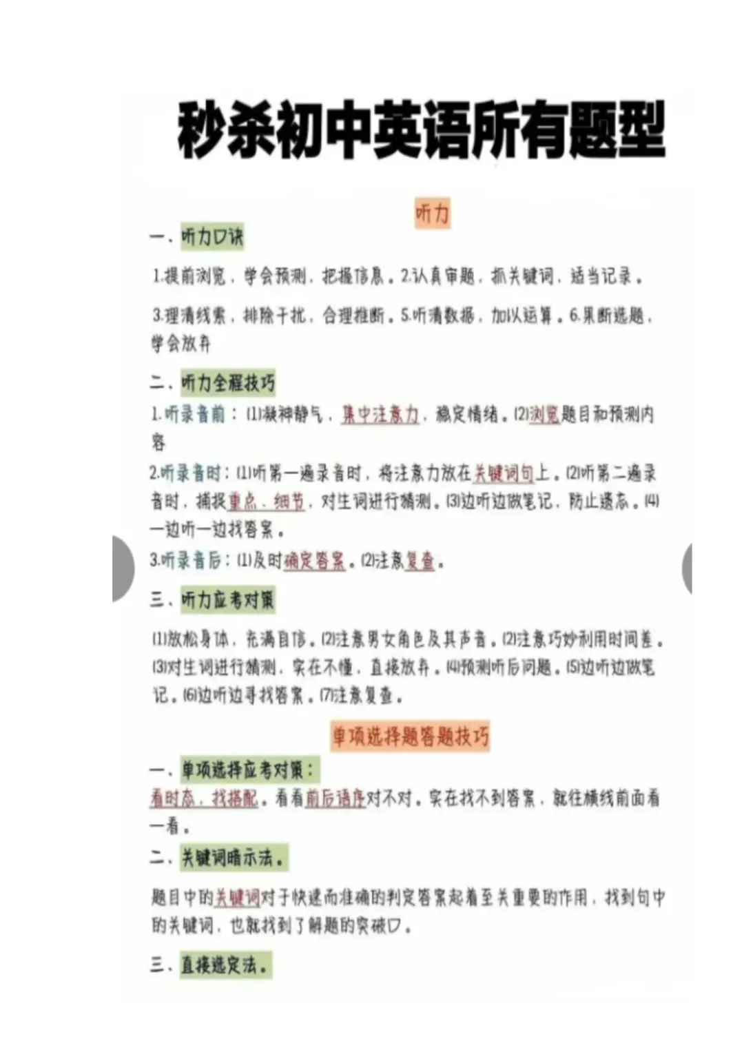 2026春通用版初中英语《初中英语所有题型答题技巧》,含详细答案共9页,电子版可打印可下载。围绕初中英语考试,帮助孩子夯实学科基础,培养孩子逻辑思维,提升知识综合运用能力与应试技巧,助力升学能力培养,从从容容的度过春季学期。欢迎转发分享到班级群, 需要的家长们和老师们抓紧领取一份吧。