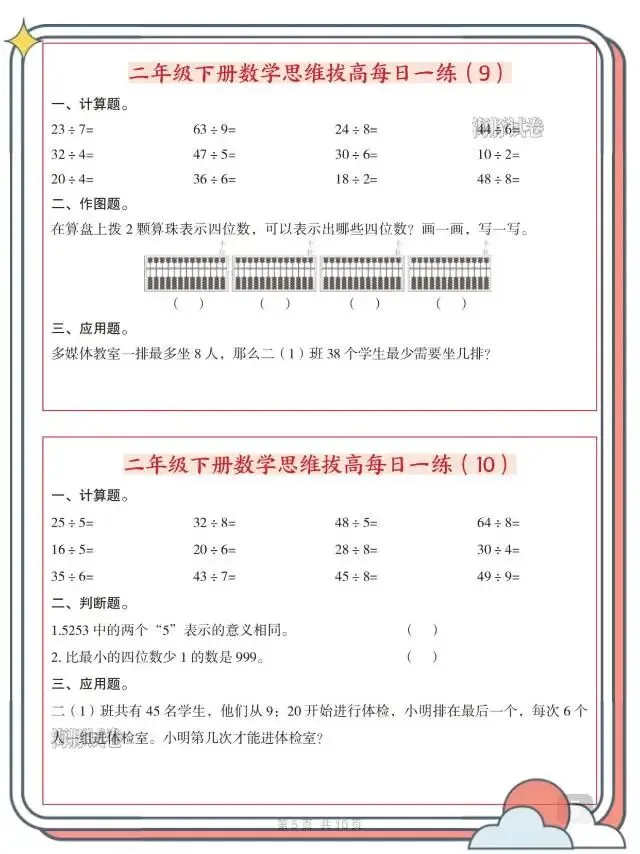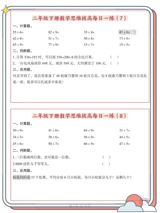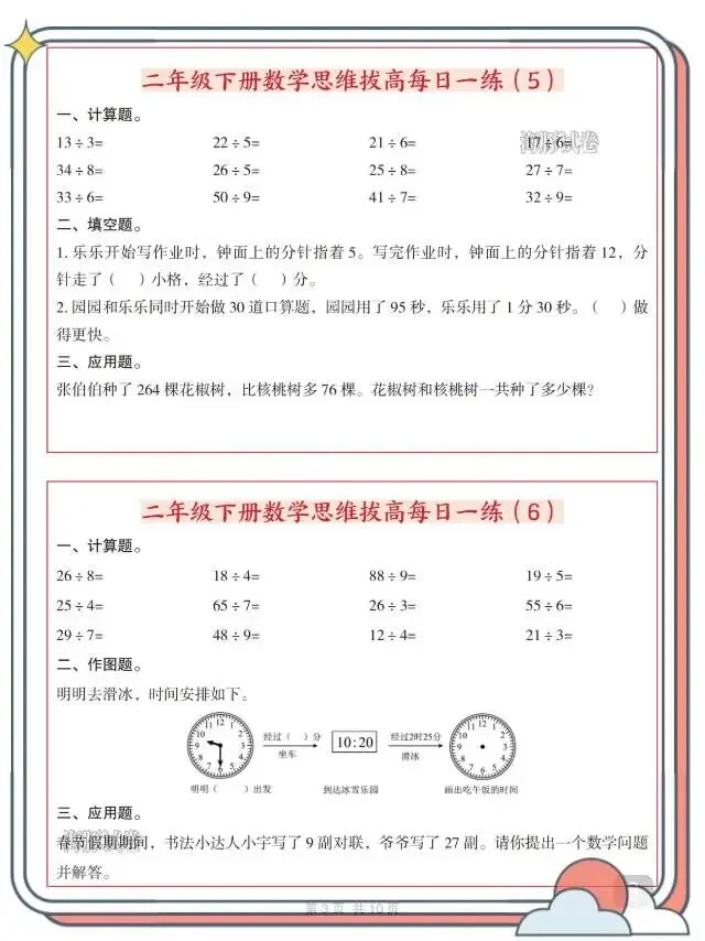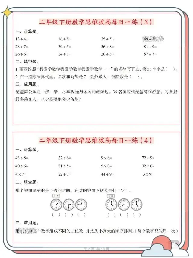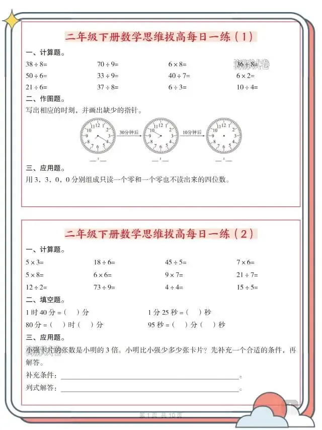 二年级(下)数学思维拔高每日一练!这份资料专为二年级下册孩子打造,每日一练轻量化设计,贴合日常学习节奏。内容涵盖计算、填空、作图、应用等多元题型,精准对接课内知识点,同时侧重思维拔高,训练有余数除法、数的组成、周期问题、进一法应用等重难点,一题多练夯实基础、拓展思路。
