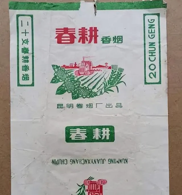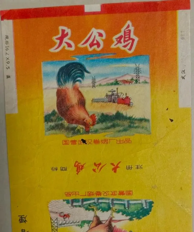 黄底上站着一只大公鸡,后面还有田地和机器,这画面一下就把乡下日子带出来了。它有点土,有点直,但特别鲜活。那个年代很多包装就是这样,图要让人一眼看懂,名字也得响亮。你要是不说这是烟盒,年轻人没准还会猜成火柴盒或者年画一角。