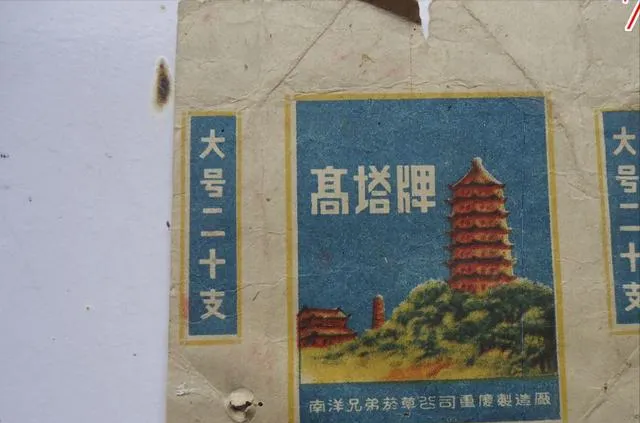 这张旧得最明显,边角磨损,纸面发黄,偏偏那座塔还站得挺稳。老烟盒上爱画塔、桥、楼、山,像是在一块小纸面上放一个地方的门脸。现在看,会觉得这类设计有些老;可换个角度想,当年很多人就是靠这些图案,记住一座城、一个厂、一个牌子。