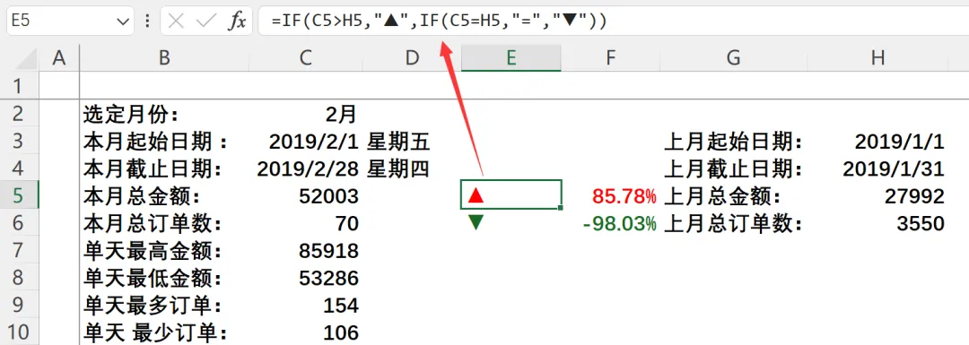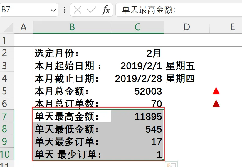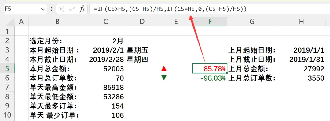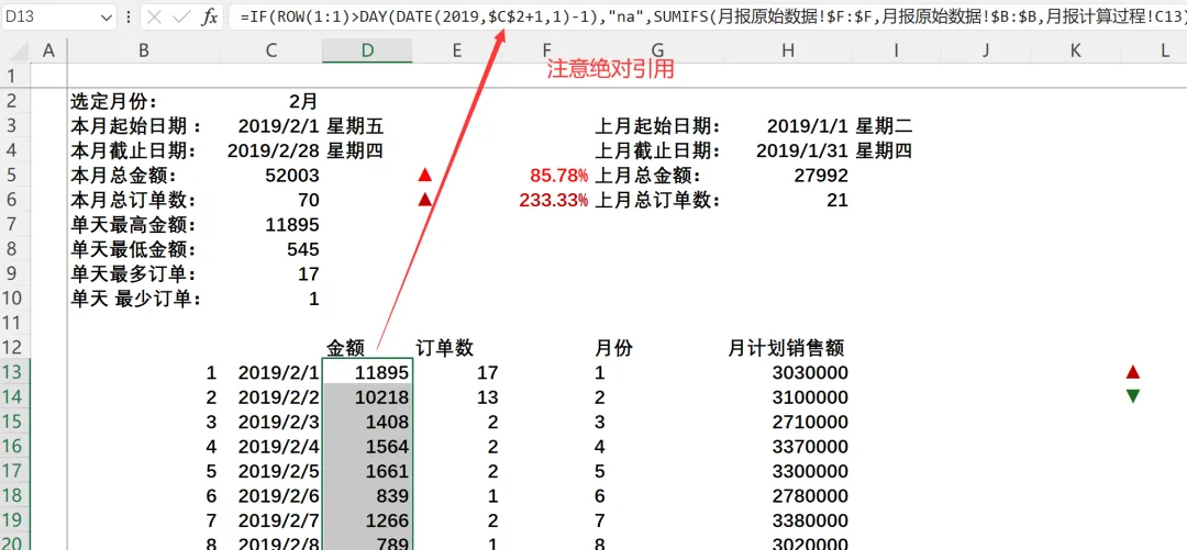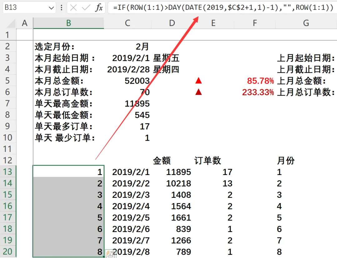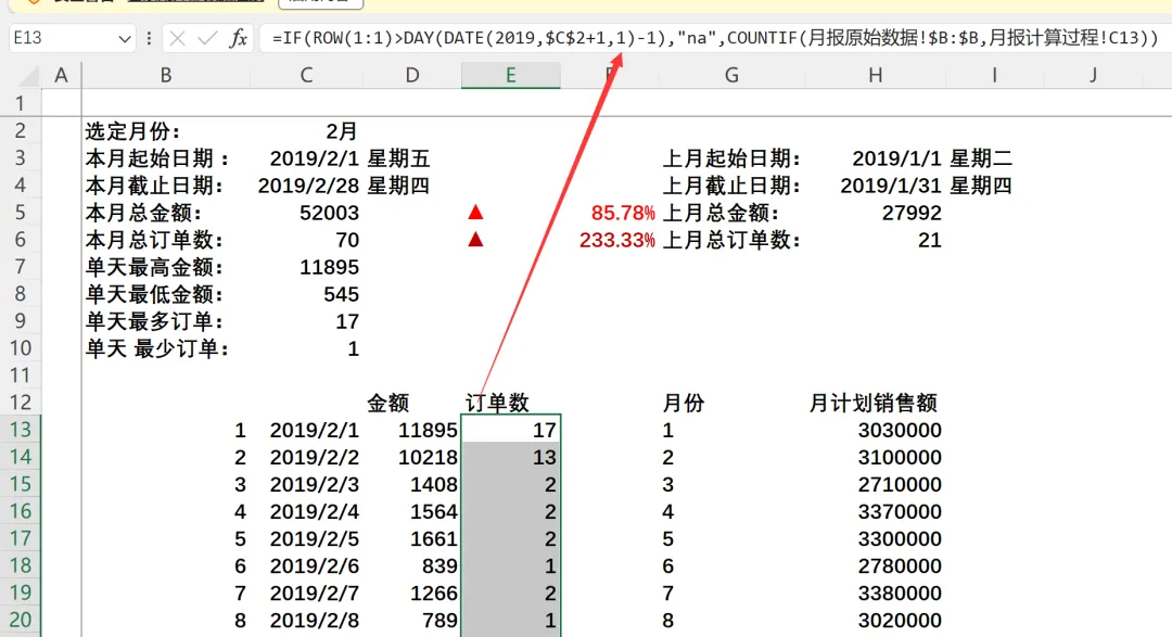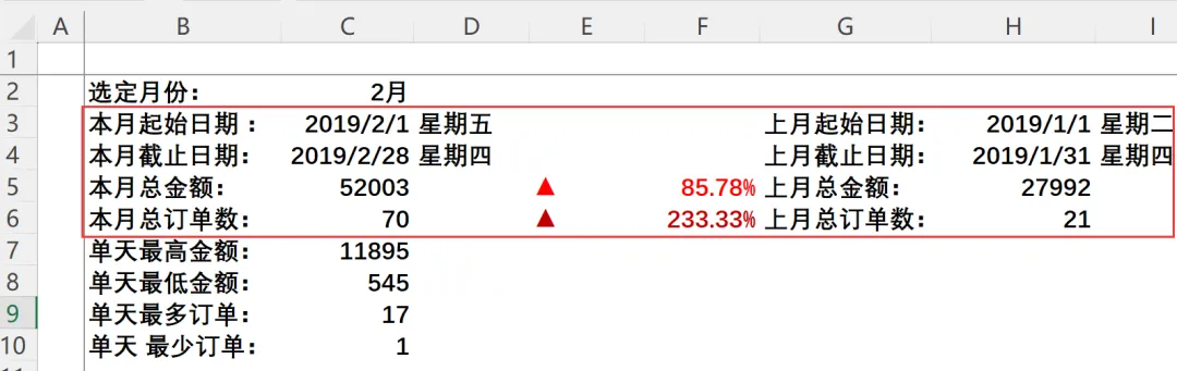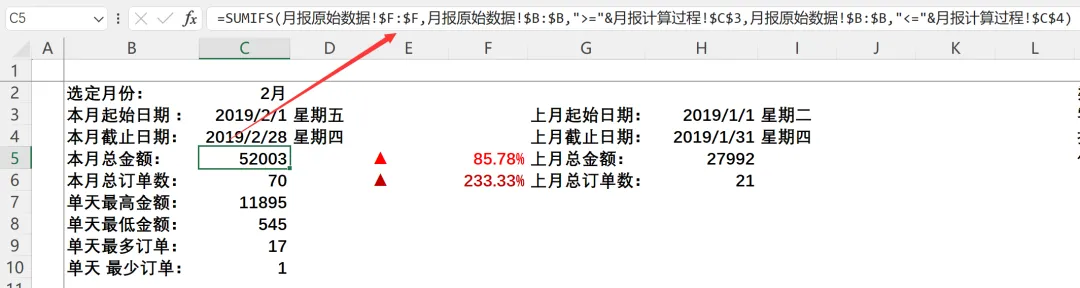 :=SUMIFS(月报原始数据!$F:$F,月报原始数据!$B:$B,”>=”&$H$3,月报原始数据!$B:$B,”<=”&$H$4) - 上月总订单数