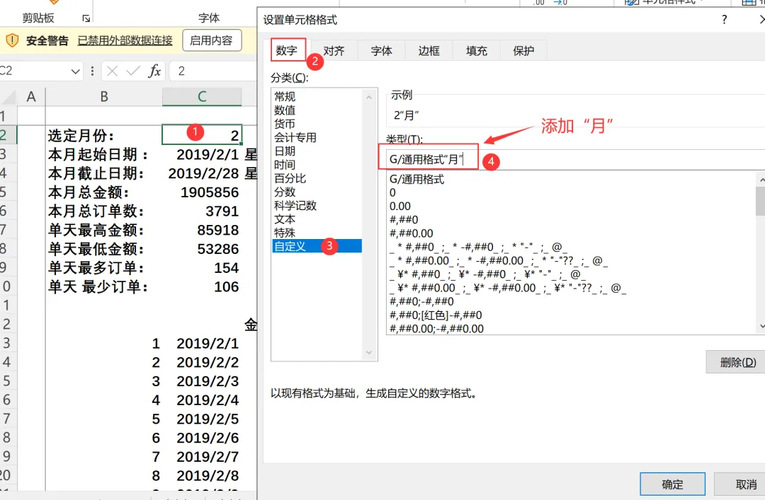 2),通过设置单元格格式将其显示为 “2 月”,操作步骤如下,后续在月报看板中会将 C2 单元格设置为与控件按钮关联,用于根据用户选择快捷指定目标月份。其他所有核心指标数据都按此单元格确定日期时段进行对应计算,如:本月起始日期,本月截止日期,上月起始日期,上月截止日期。