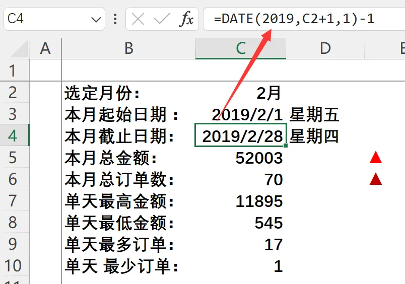 -DAY(C4)提取这个日期的 “日” 部分,也就是本月总天数(28);