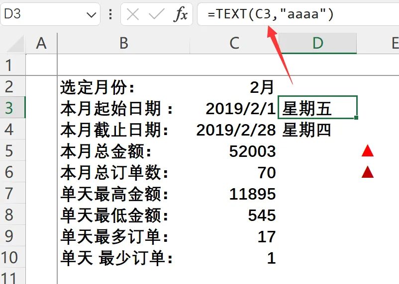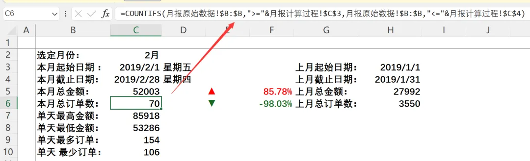 本月总订单数 =COUNTIFS(月报原始数据!$B:$B,”>=”&$C$3,月报原始数据!$B:$B,”<=”&$C$4)