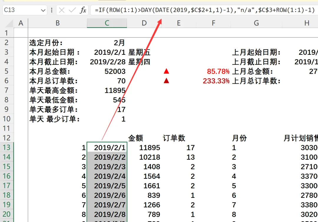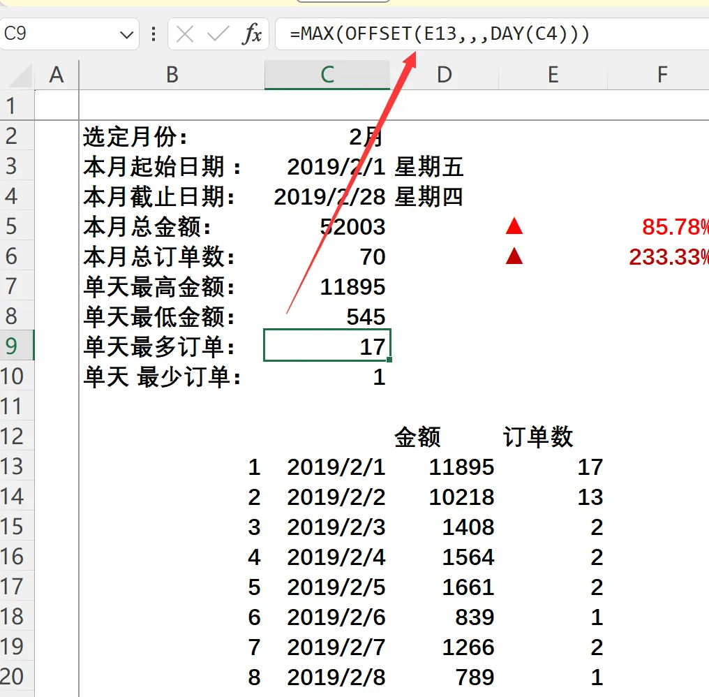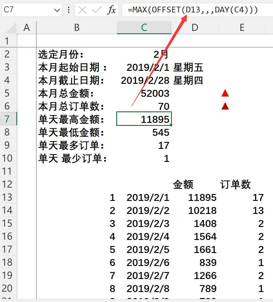 起点: D13(本月第一天金额所在单元格) -