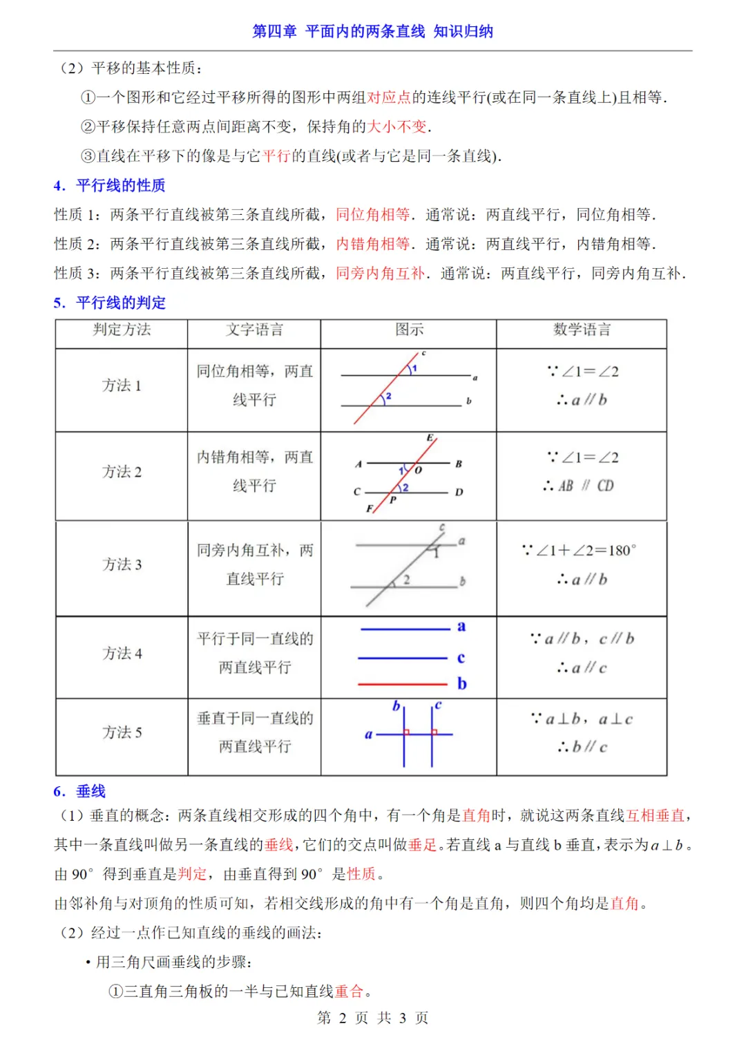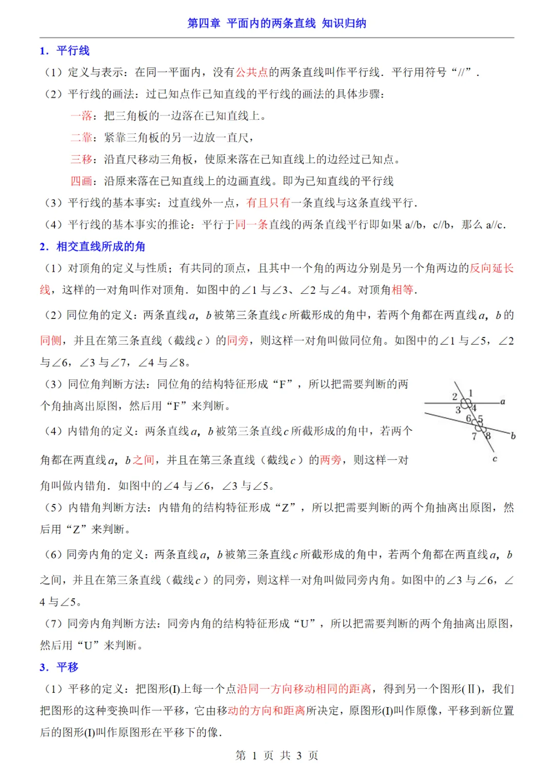【免费下载】七年级(下)数学第4章平面内的两条直线 知识归纳(湘教版),PDF电子版,可打印,共3页,先保存,以免资源失效