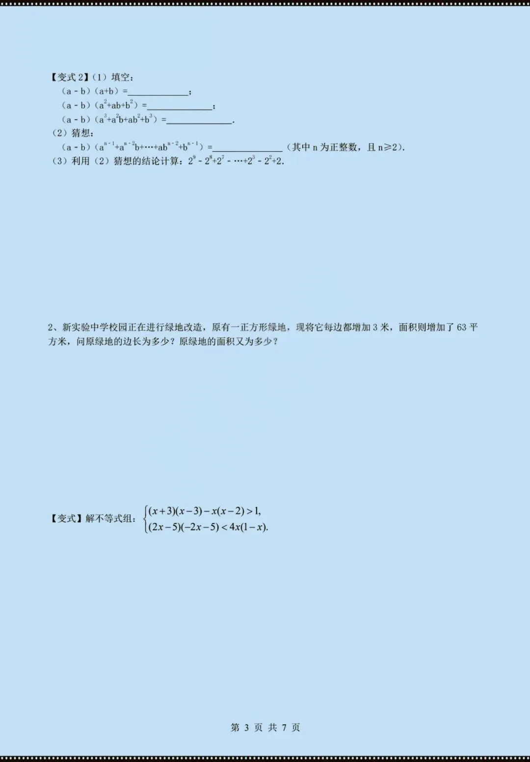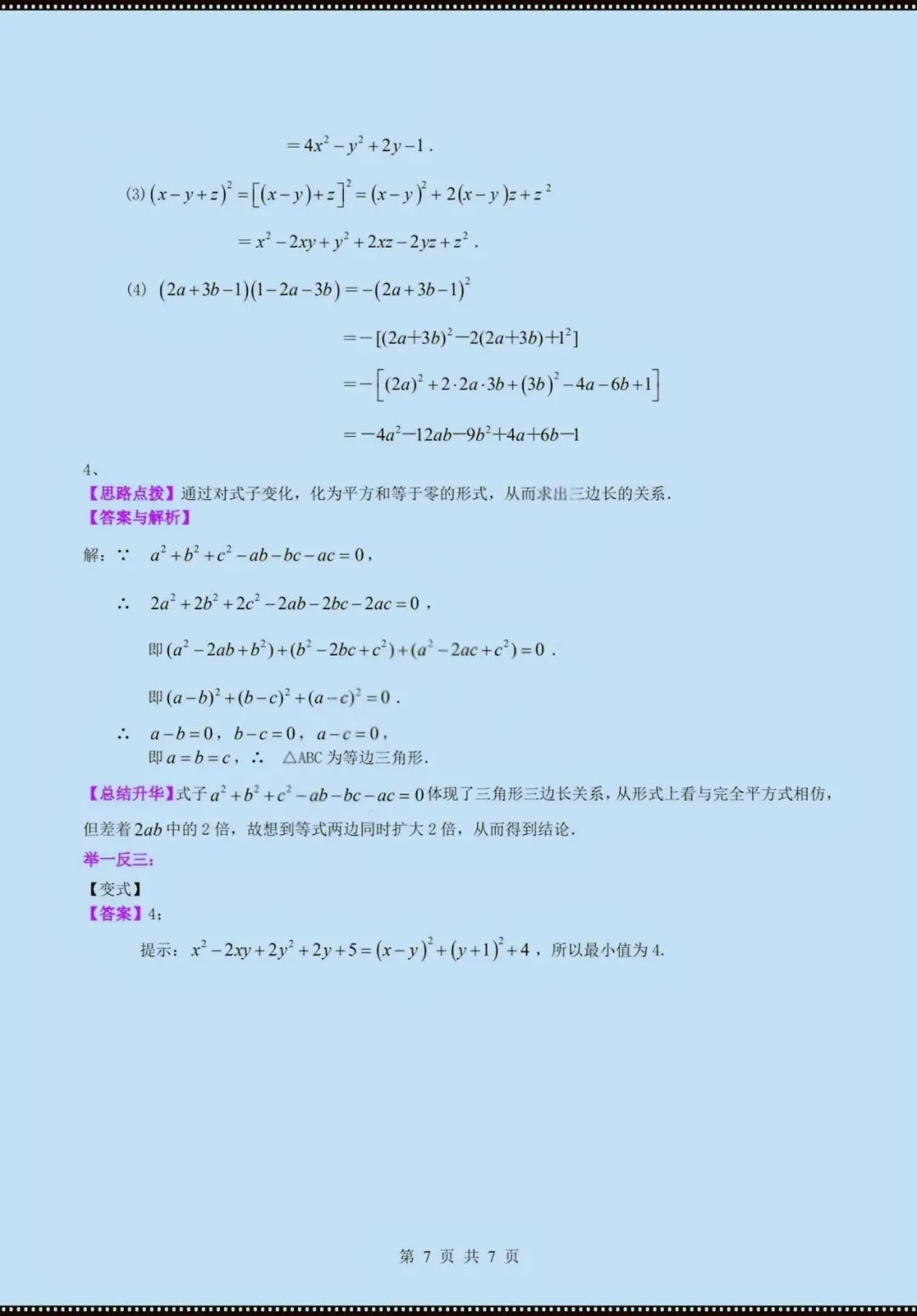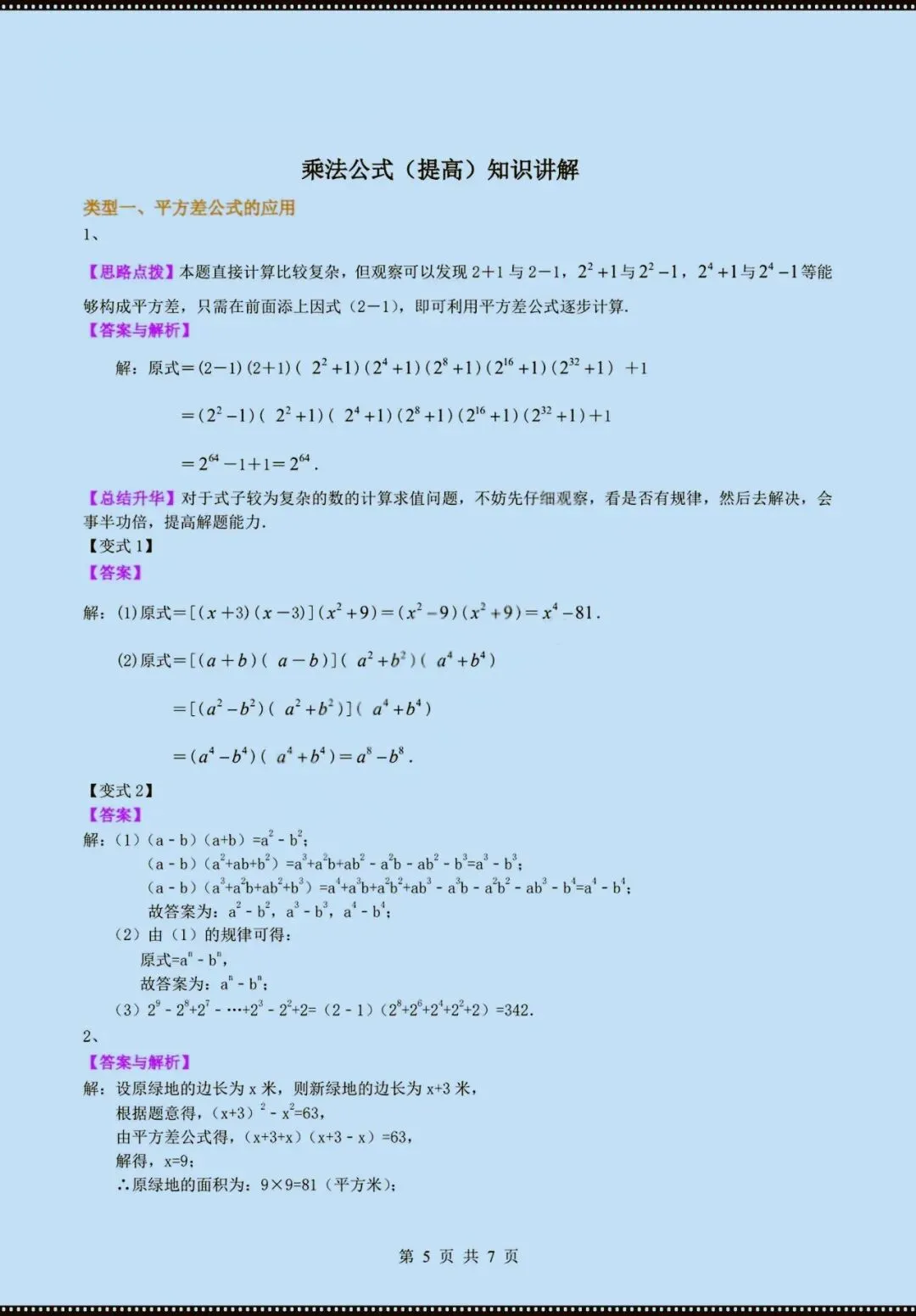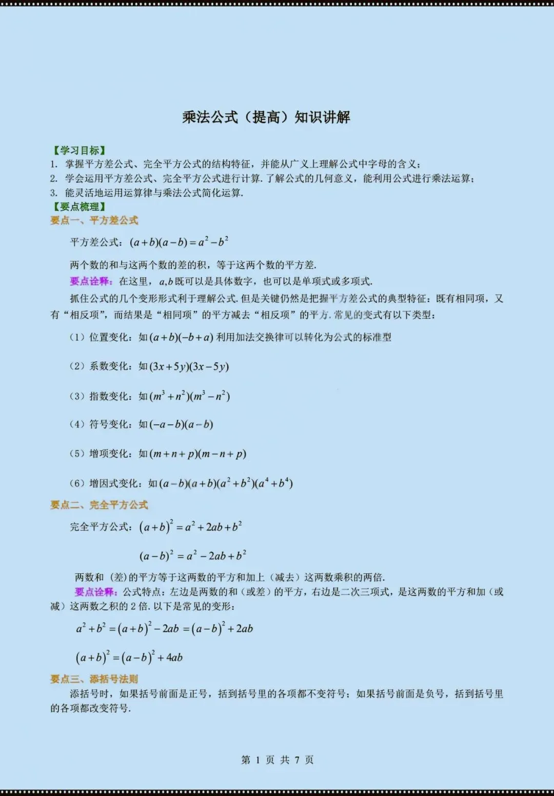 今天老师给大家整理了:七年级下册数学乘法公式知识讲解(电子版可打印)