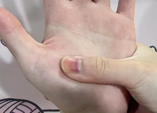 伸出手,手心朝上,看大拇指根部下方那块最厚实、最有肉的部位(简称大鱼际)。