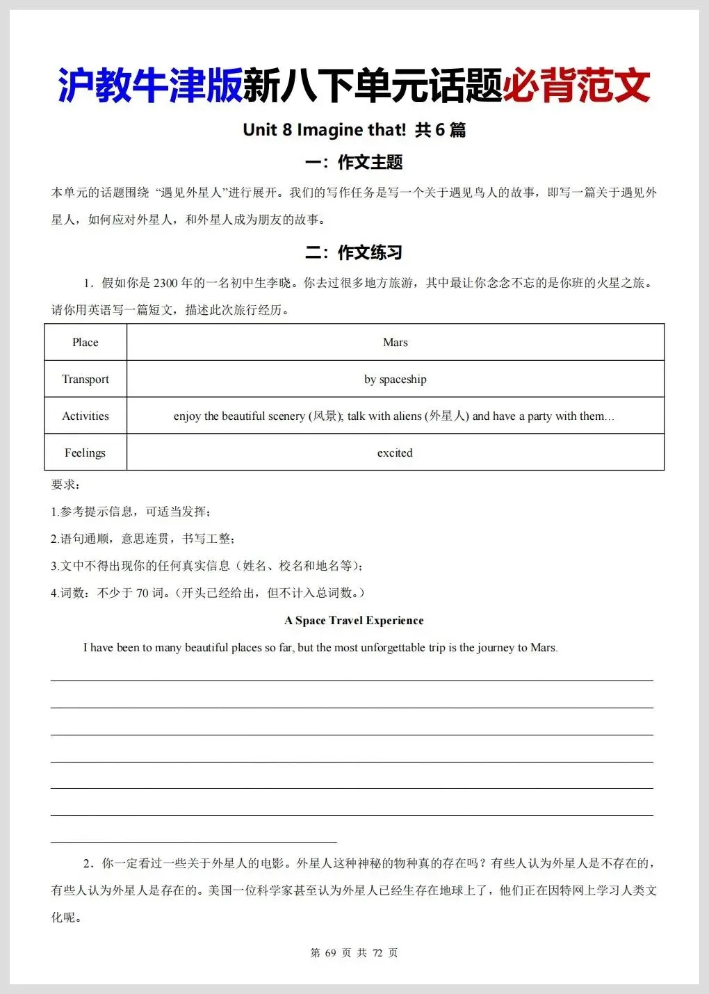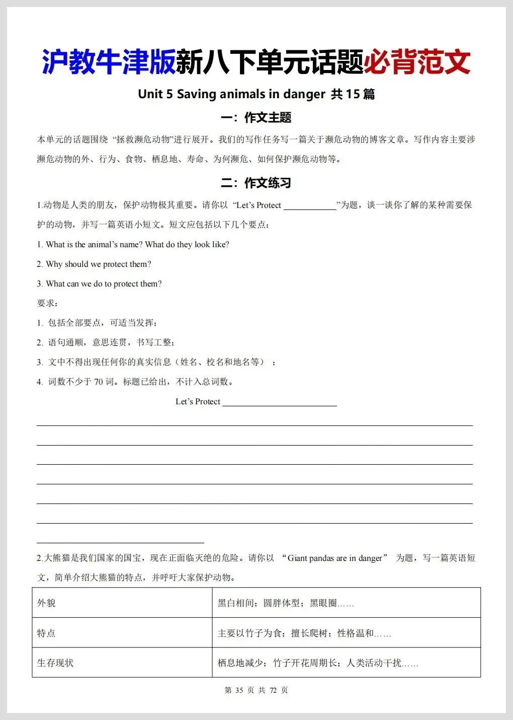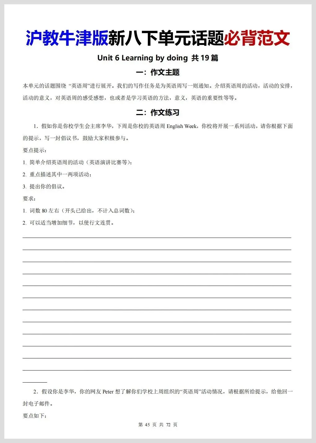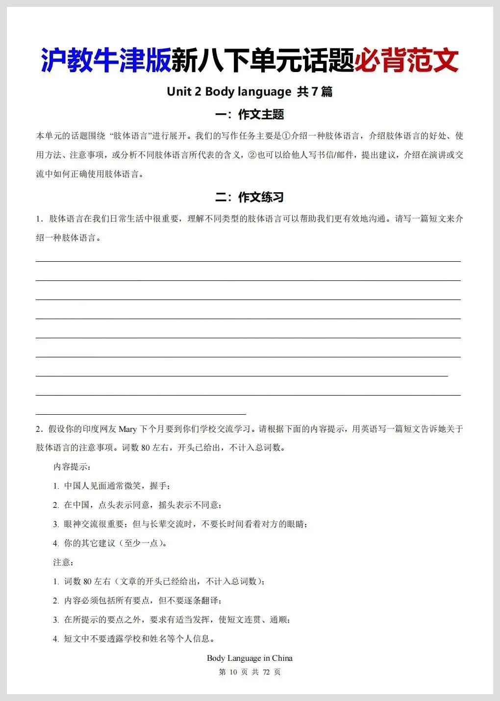 沪教牛津版八年级下册U1-U8单元话题必背范文,直接套用拿高分,可打印!