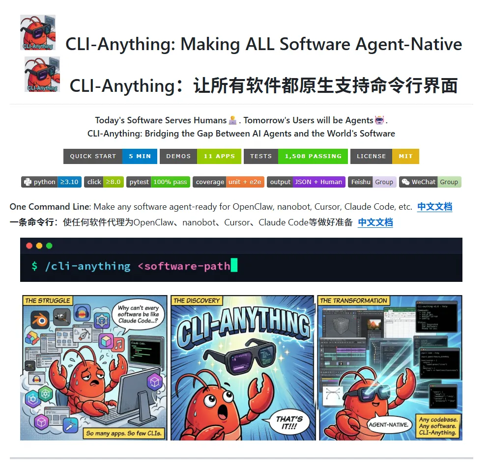 项目地址:https://github.com/HKUDS/CLI-Anything