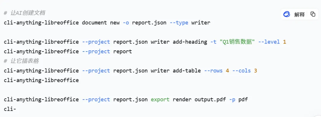 它把软件那些藏在底层的功能,直接暴露成一行行命令。AI不用看屏幕、不用点鼠标,敲命令就能干活。