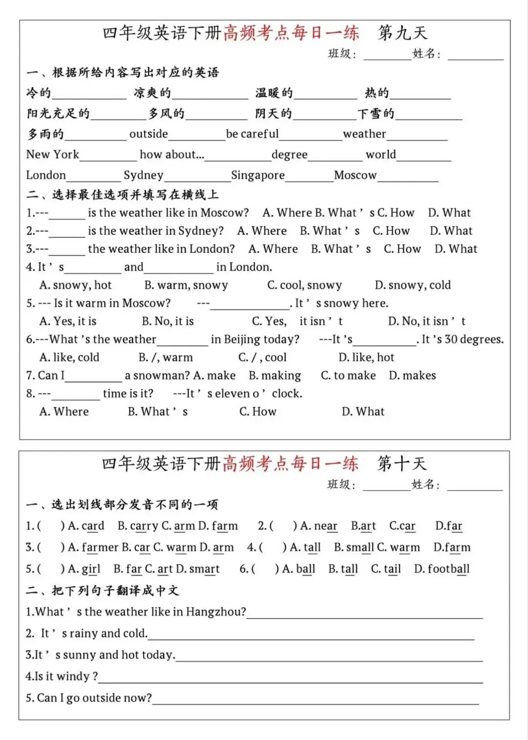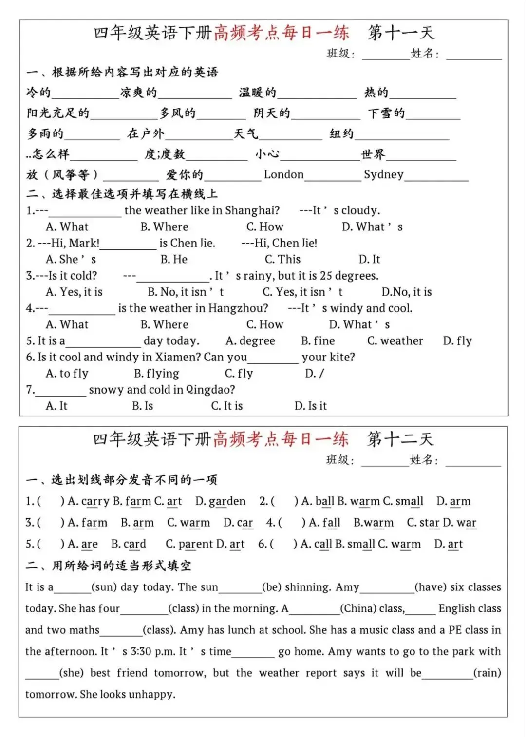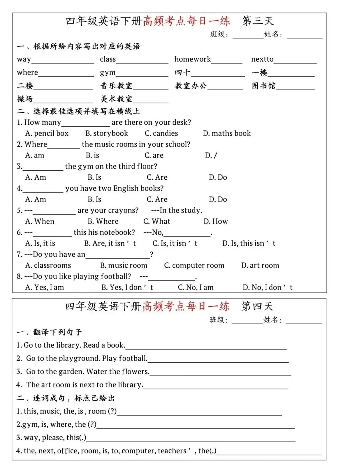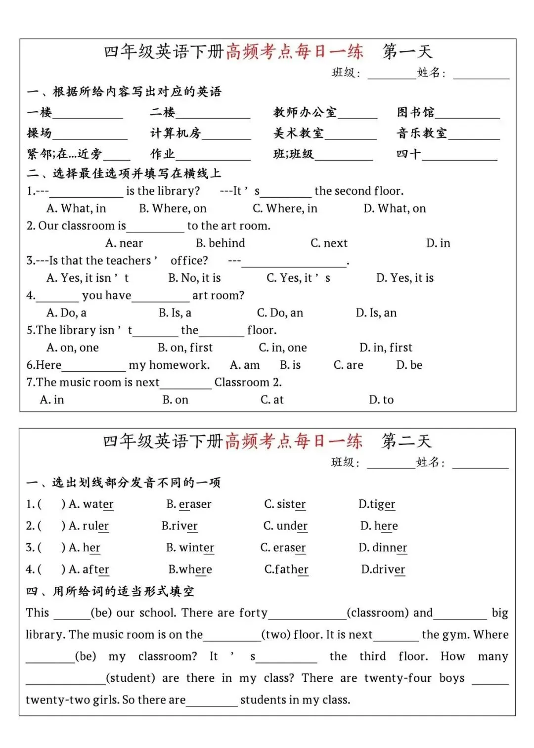 四年级下册英语高频考点每日一练,电子版可下载打印