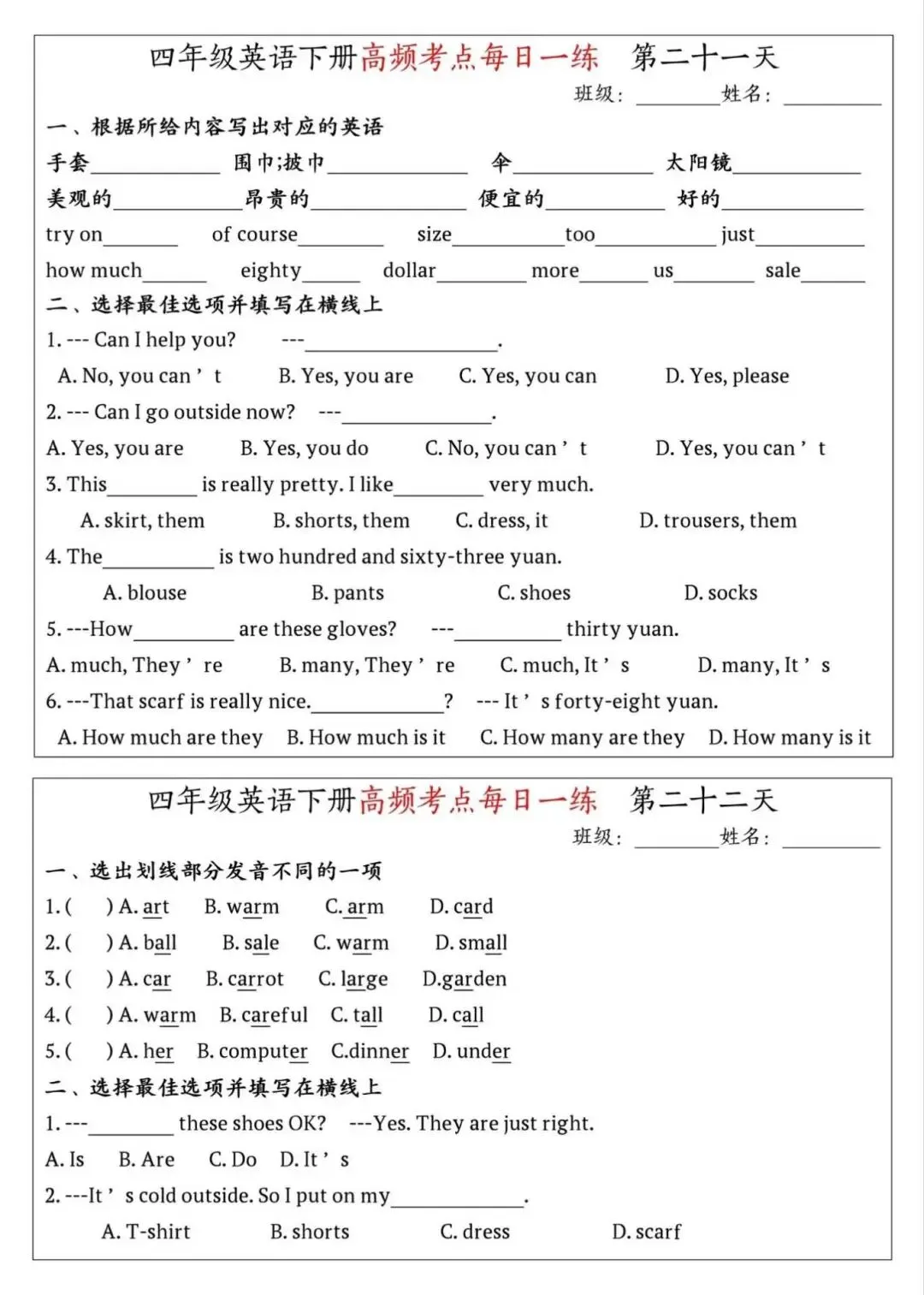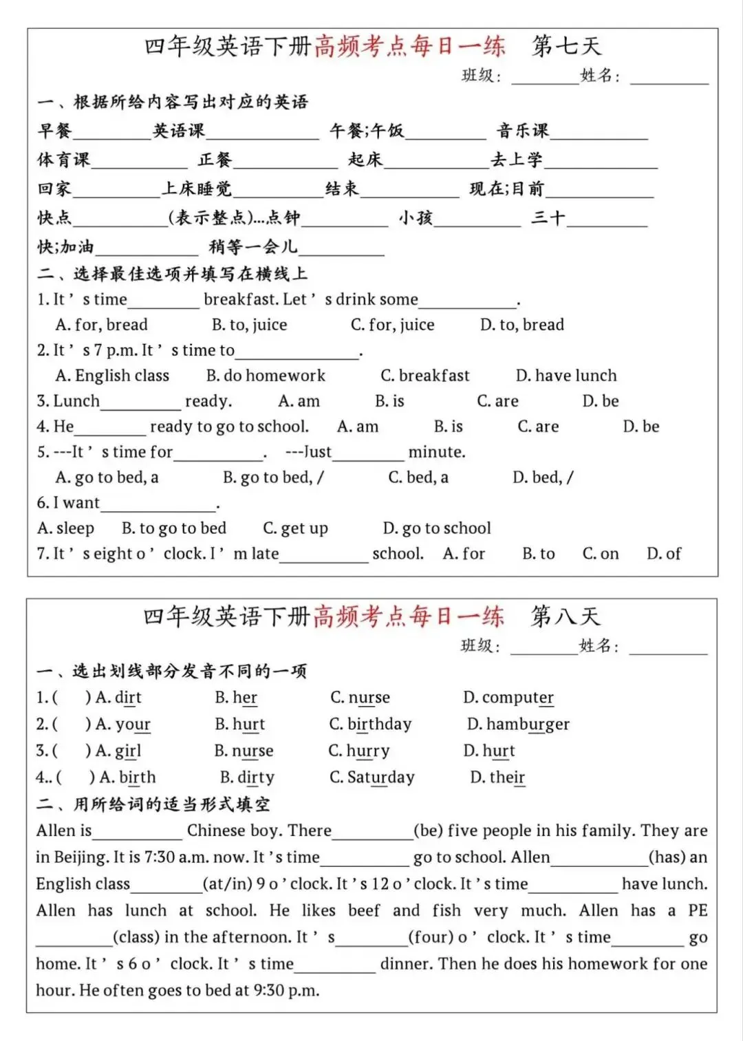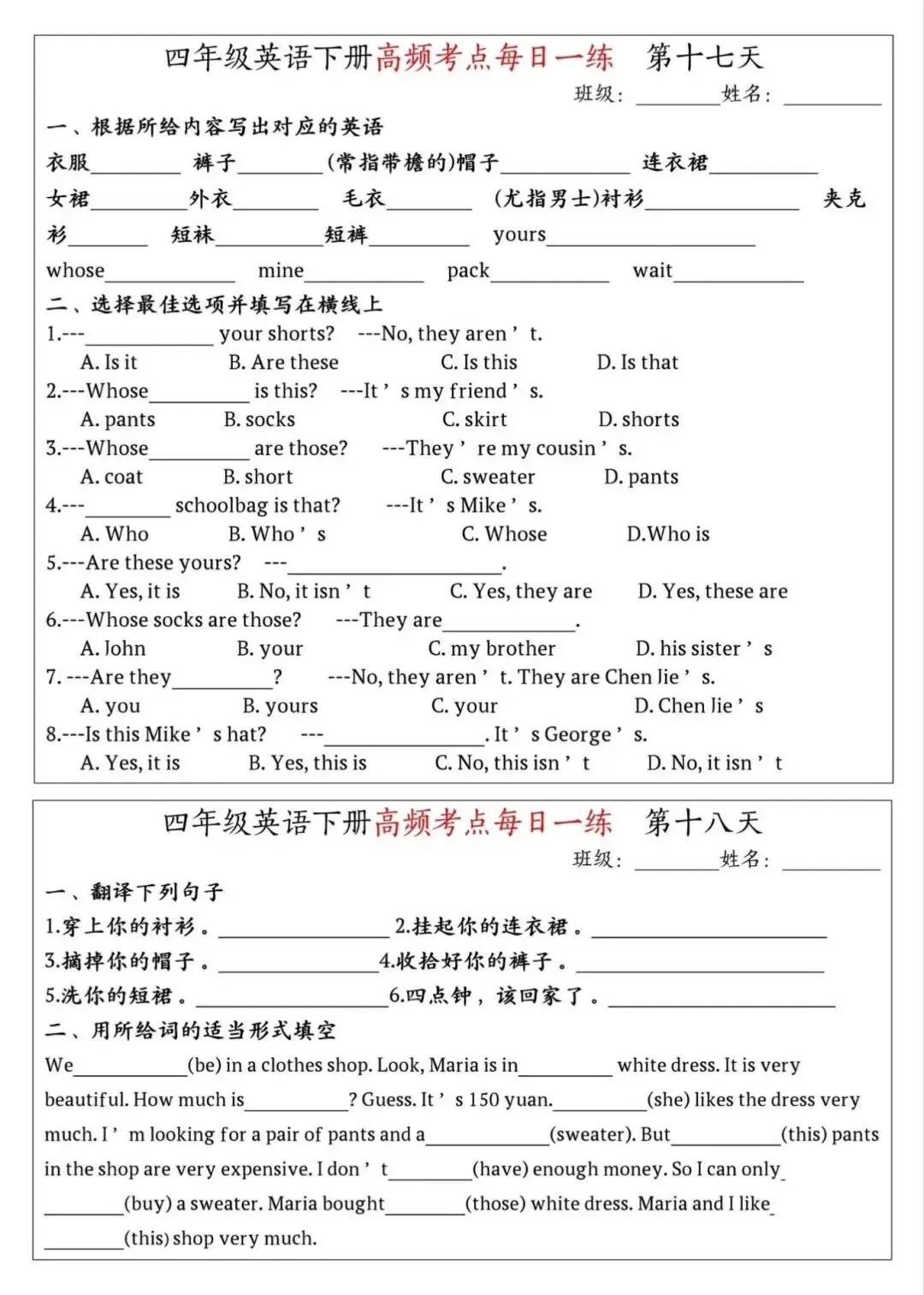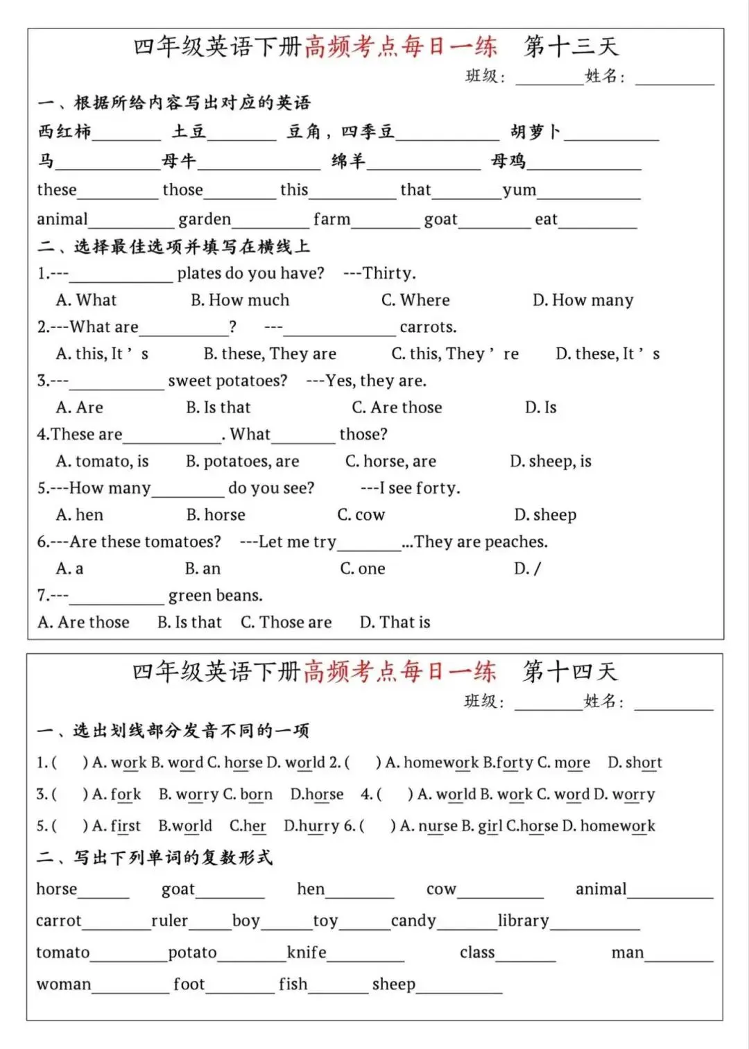 四年级下册英语高频考点每日一练,电子版可下载打印