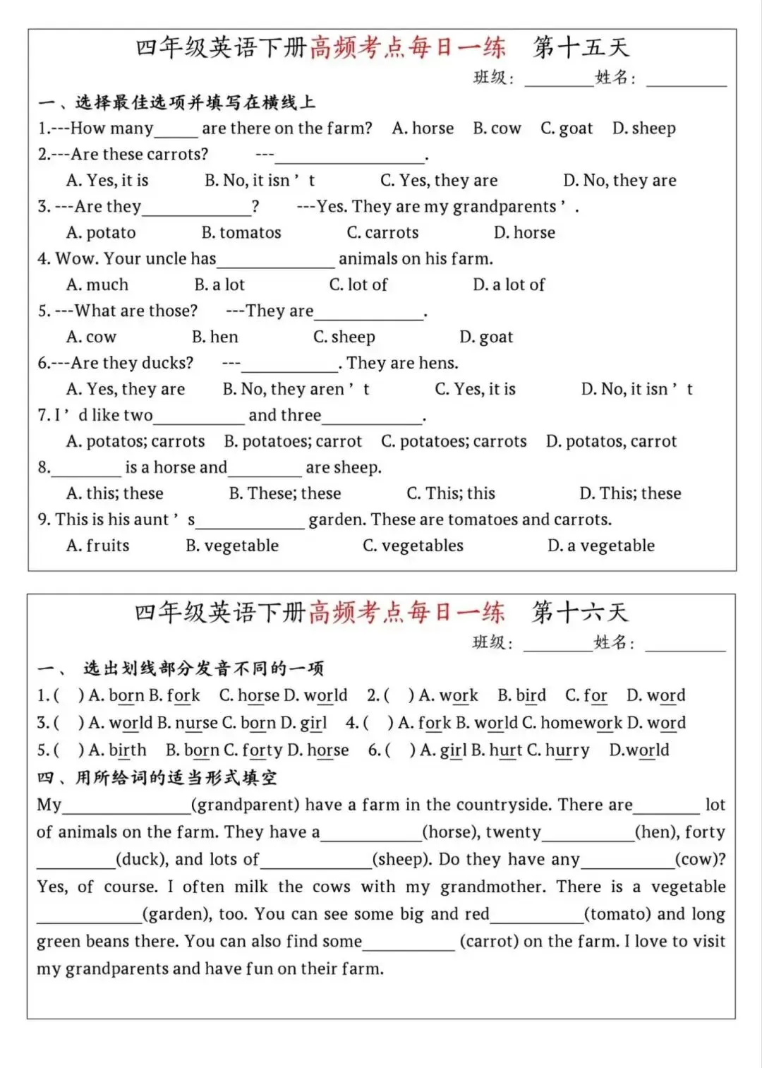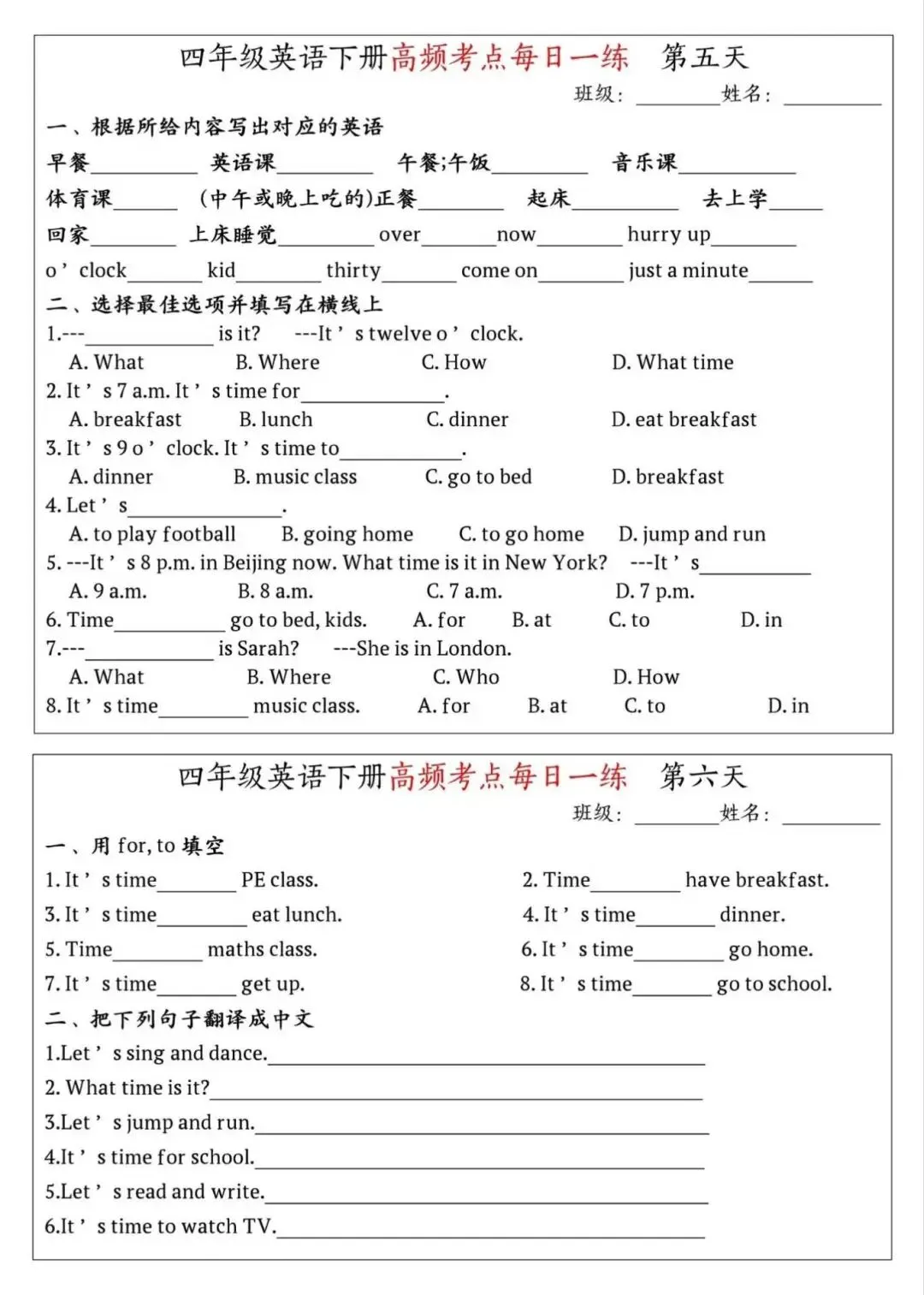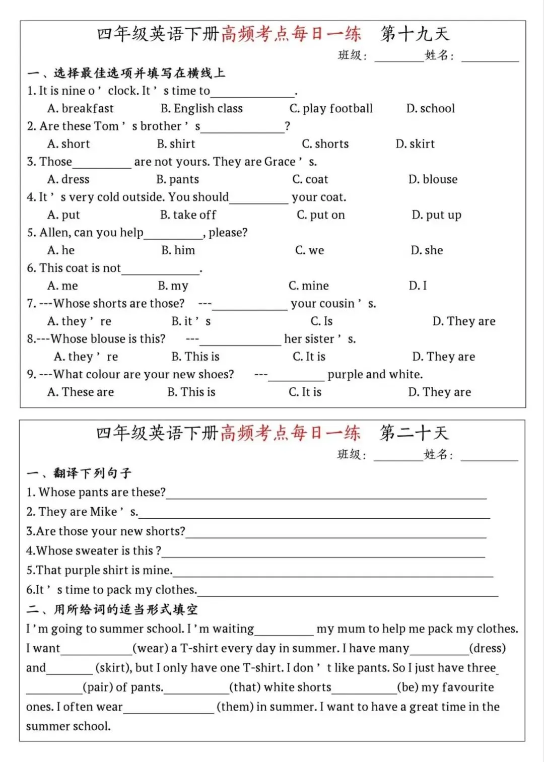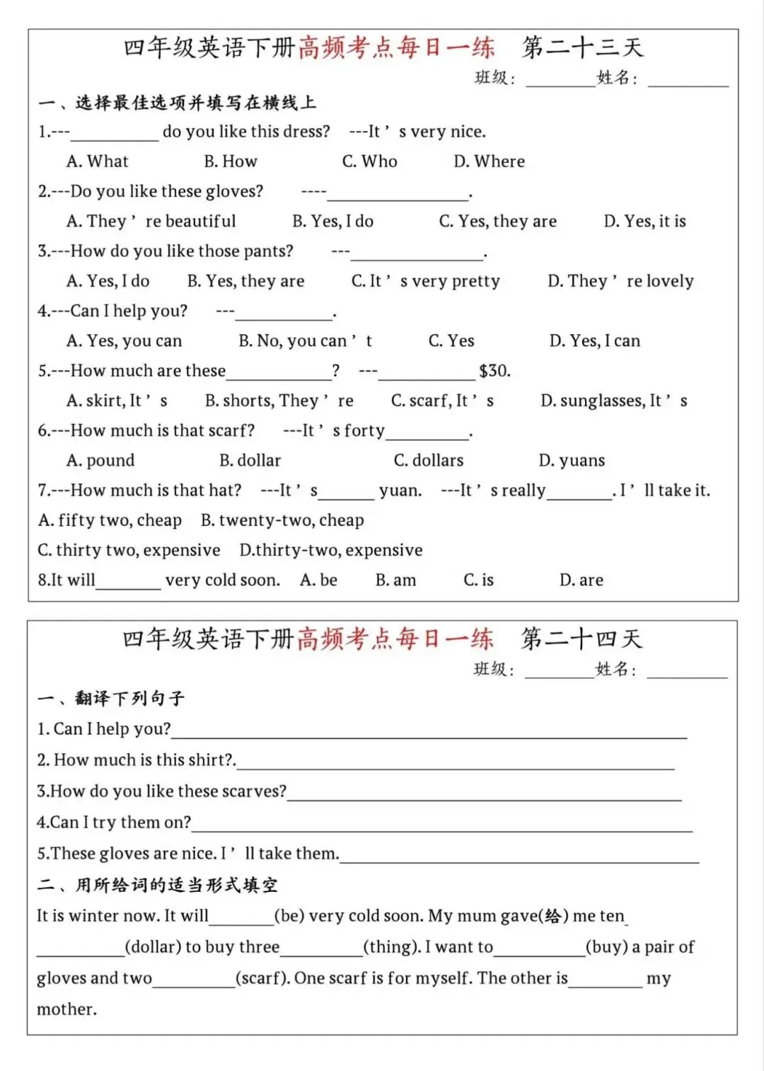 四年级下册英语高频考点每日一练,电子版可下载打印
