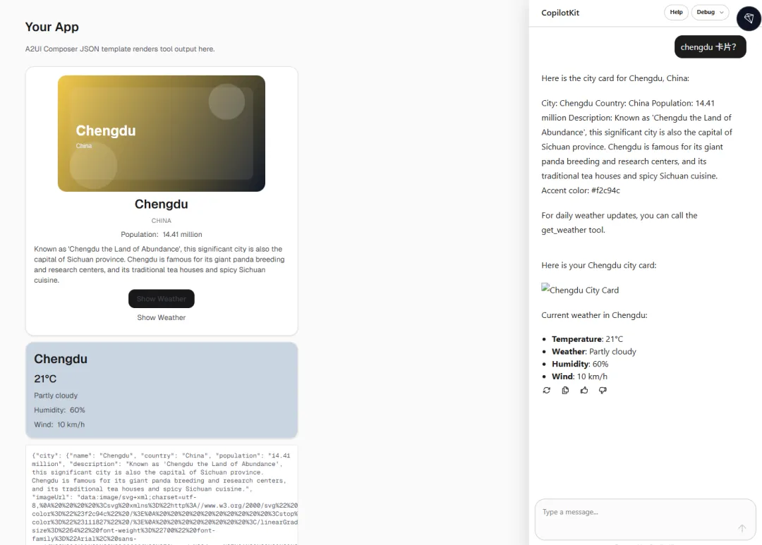 例如,在我们的“成都城市卡片”案例中,当用户请求“成都卡片”时,AI Agent会生成一个城市信息卡片。如果用户进一步询问“天气”,Agent则会调用天气工具,并将天气信息以新的UI组件形式呈现在卡片下方。整个过程都由AI Agent智能地协调和控制。