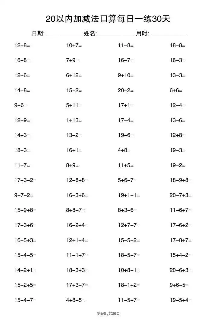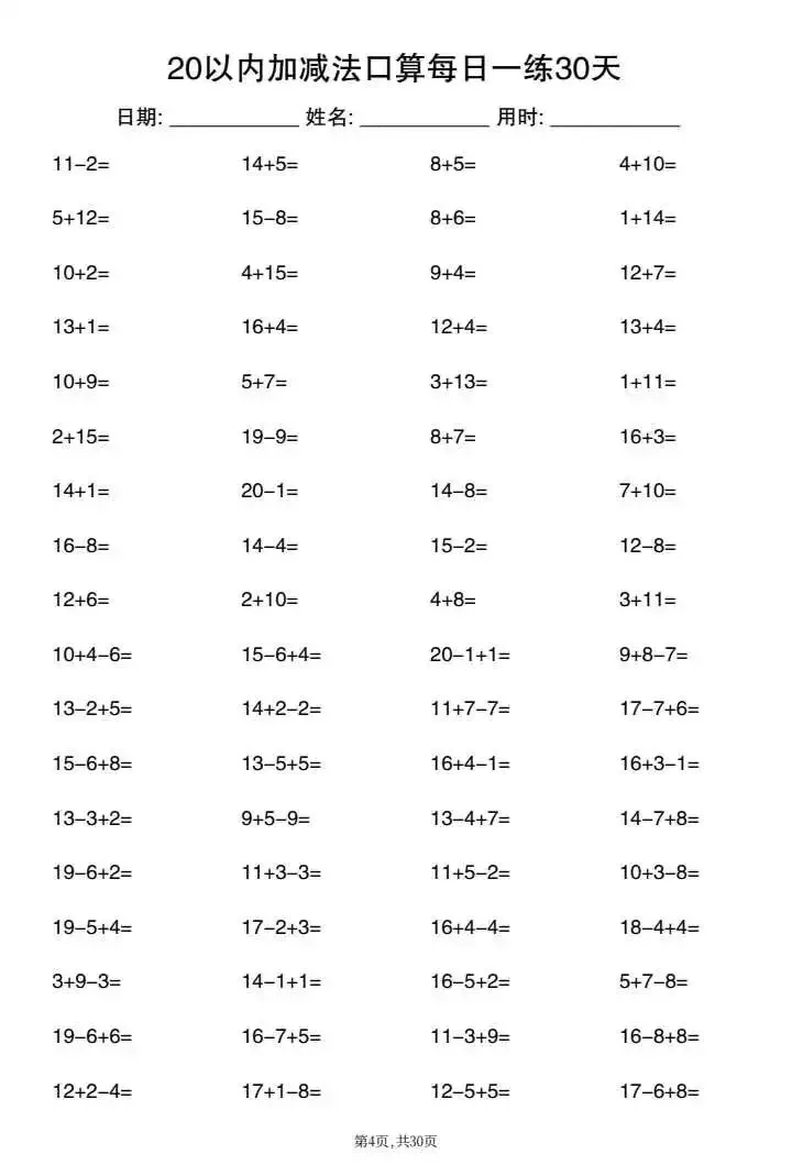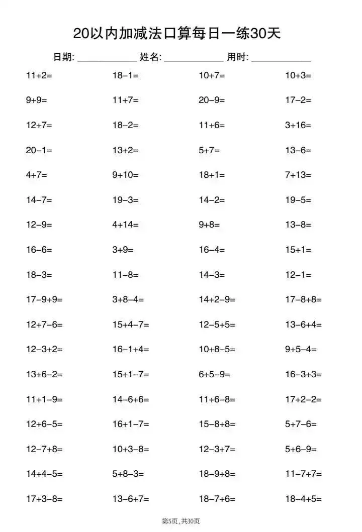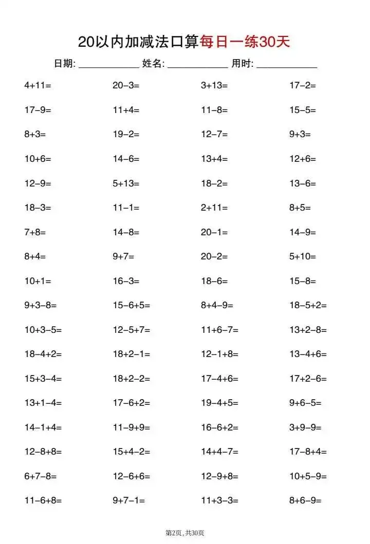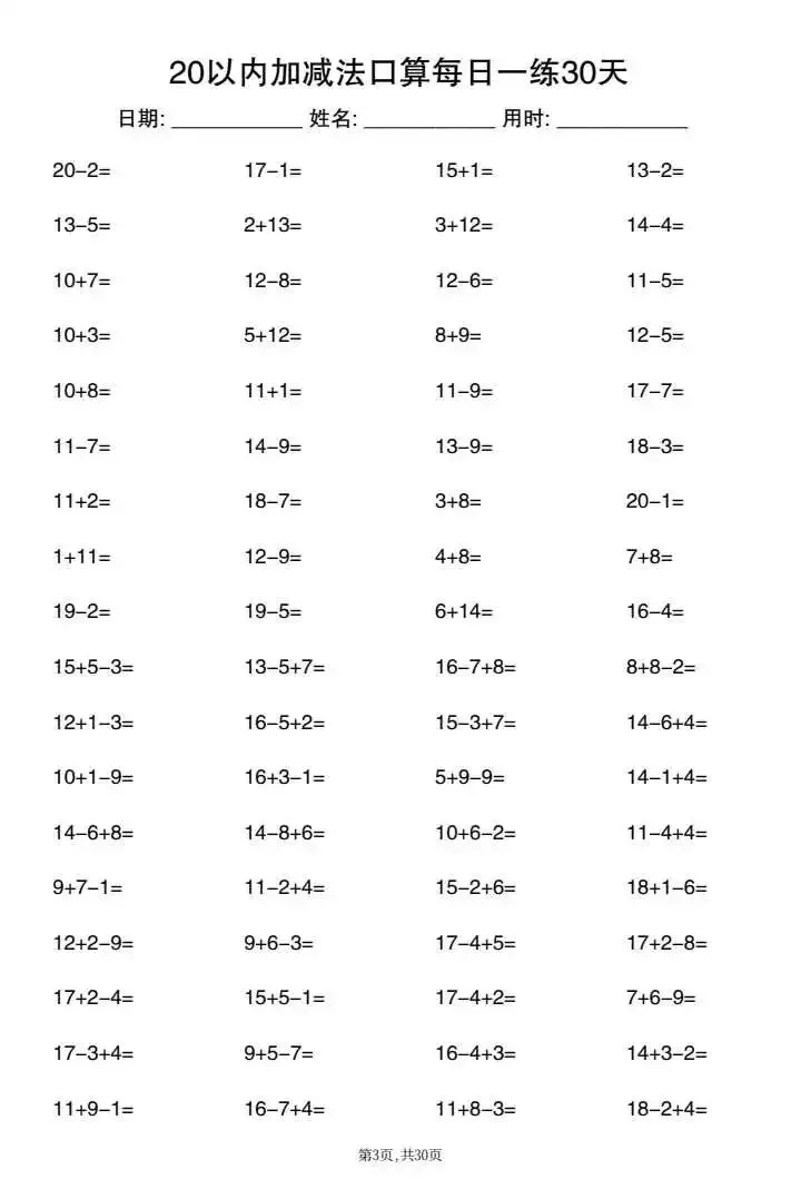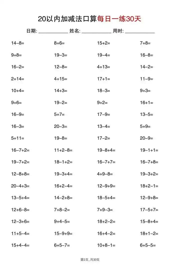 26新一年级20以内加减法口算每日一练(电子版可打印)