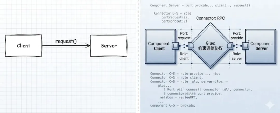 连接件 Connector,用来建立组件之间的交互关系,比如说是过程调用,还是 管道,还是 协议 之类的
