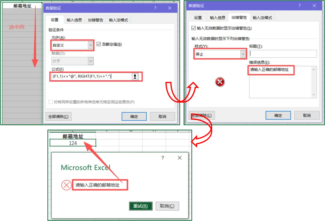 ④设置完成后,可以进行验证,一旦输入错误邮箱地址,Excel会报错提醒。