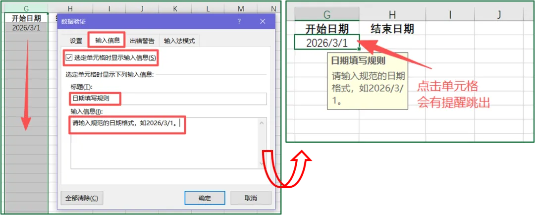 ③勾选“选定单元格时显示输入信息”,进行相应规则提醒,如图所示: