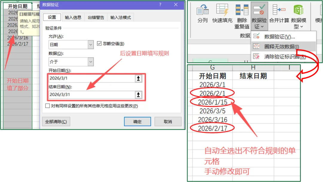 ③自动标记出不符合规则的数据,手动修改即可。