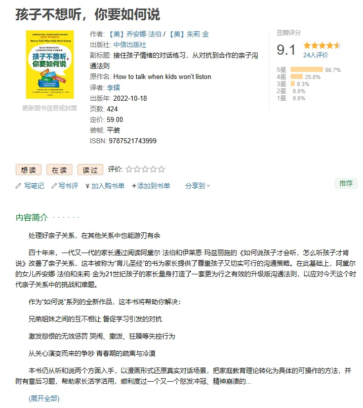 作者: 【美】乔安娜·法伯 / 【美】朱莉·金出版社: 中信出版社副标题: 接住孩子情绪的对话练习,从对抗到合作的亲子沟通法则原作名: How to talk when kids won’t liston译者: 李镭出版年: 2022-10-18ISBN: 9787521743999