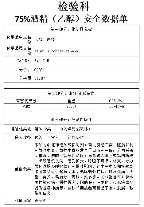 检验科75%酒精(乙醇)安全数据单(电子版) 检验科75%酒精(乙醇)安全数据单(电子版) 文章仅作分享,如有侵权请联系我们。 需要全文电子版转发此链接至100人以上检验群5分钟后截图发至18210297902微信同号,获取完整电子版! 点点红点点赞,感谢大家