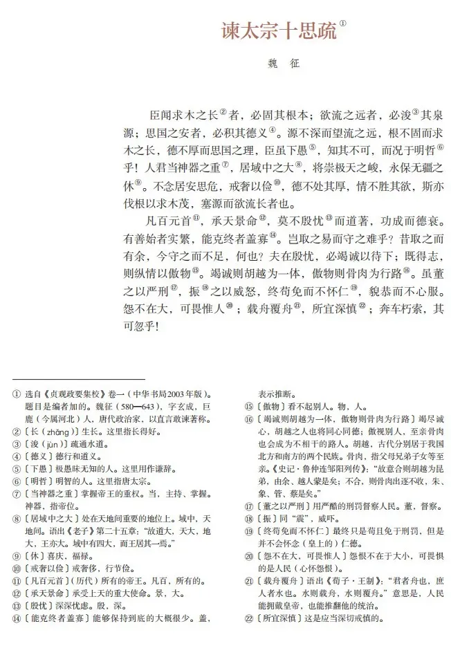 臣闻:求木之长者,必固其根本;欲流之远者,必浚其泉源;思国之安者,必积其德义。源不深而望流之远,根不固而求木之长,德不厚而思国之安,臣虽下愚,知其不可,而况于明哲乎?人君当神器之重,居域中之大,将崇极天之峻,永保无疆之休。不念居安思危,戒奢以俭,德不处其厚,情不胜其欲,斯亦伐根以求木茂,塞源而欲流长也。凡百元首,承天景命,莫不殷忧而道著,功成而德衰,有善始者实繁,能克终者盖寡。岂其取之易守之难乎?昔取之而有余,今守之而不足,何也?夫在殷忧必竭诚以待下,既得志则纵情以傲物;竭诚则吴、越为一体,傲物则骨肉为行路。虽董之以严刑,震之以威怒,终苟免而不怀仁,貌恭而不心服。怨不在大,可畏惟人;载舟覆舟,所宜深慎。奔车朽索,其可忽乎?君人者,诚能见可欲,则思知足以自戒;将有作,则思知止以安人;念高危,则思谦冲而自牧;惧满溢,则思江海下百川;乐盘游,则思三驱以为度;忧懈怠,则思慎始而敬终;虑壅蔽,则思虚心以纳下;惧谗邪,则思正身以黜恶;恩所加,则思无因喜以谬赏;罚所及,则思无以怒而滥刑。总此十思,宏兹九德,简能而任之,择善而从之,则智者尽其谋,勇者竭其力,仁者播其惠,信者效其忠;文武争驰,君臣无事,可以尽豫游之乐,可以养松乔之寿,鸣琴垂拱,不言而化。何必劳神苦思,代下司职,役聪明之耳目,亏无为之大道哉?