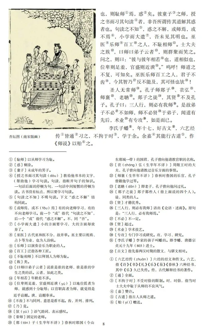 古之学者必有师。师者,所以传道受业解惑也。人非生而知之者,孰能无惑?惑而不从师,其为惑也,终不解矣。生乎吾前,其闻道也固先乎吾,吾从而师之;生乎吾后,其闻道也亦先乎吾,吾从而师之。吾师道也,夫庸知其年之先后生于吾乎?是故无贵无贱,无长无少,道之所存,师之所存也。嗟乎!师道之不传也久矣!欲人之无惑也难矣!古之圣人,其出人也远矣,犹且从师而问焉;今之众人,其下圣人也亦远矣,而耻学于师。是故圣益圣,愚益愚。圣人之所以为圣,愚人之所以为愚,其皆出于此乎?爱其子,择师而教之;于其身也,则耻师焉,惑矣。彼童子之师,授之书而习其句读者,非吾所谓传其道解其惑者也。句读之不知,惑之不解,或师焉,或不焉,小学而大遗,吾未见其明也。巫医乐师百工之人,不耻相师。士大夫之族,曰师曰弟子云者,则群聚而笑之。问之,则曰:“彼与彼年相若也,道相似也,位卑则足羞,官盛则近谀。”呜呼!师道之不复,可知矣。巫医乐师百工之人,君子不齿,今其智乃反不能及,其可怪也欤!圣人无常师。孔子师郯子、苌弘、师襄、老聃。郯子之徒,其贤不及孔子。孔子曰:三人行,则必有我师。是故弟子不必不如师,师不必贤于弟子,闻道有先后,术业有专攻,如是而已。李氏子蟠,年十七,好古文,六艺经传皆通习之,不拘于时,学于余。余嘉其能行古道,作《师说》以贻之。