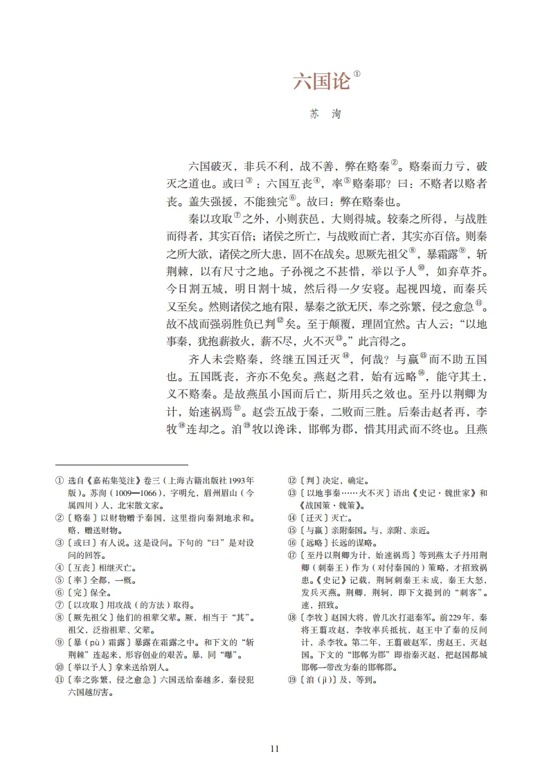 六国破灭,非兵不利,战不善,弊在赂秦。赂秦而力亏,破灭之道也。或曰:六国互丧,率赂秦耶?曰:不赂者以赂者丧,盖失强援,不能独完。故曰:弊在赂秦也。秦以攻取之外,小则获邑,大则得城。较秦之所得,与战胜而得者,其实百倍;诸侯之所亡,与战败而亡者,其实亦百倍。则秦之所大欲,诸侯之所大患,固不在战矣。思厥先祖父,暴霜露,斩荆棘,以有尺寸之地。子孙视之不甚惜,举以予人,如弃草芥。今日割五城,明日割十城,然后得一夕安寝。起视四境,而秦兵又至矣。然则诸侯之地有限,暴秦之欲无厌,奉之弥繁,侵之愈急。故不战而强弱胜负已判矣。至于颠覆,理固宜然。古人云:“以地事秦,犹抱薪救火,薪不尽,火不灭。”此言得之。齐人未尝赂秦,终继五国迁灭,何哉?与嬴而不助五国也。五国既丧,齐亦不免矣。燕赵之君,始有远略,能守其土,义不赂秦。是故燕虽小国而后亡,斯用兵之效也。至丹以荆卿为计,始速祸焉。赵尝五战于秦,二败而三胜。后秦击赵者再,李牧连却之。洎牧以谗诛,邯郸为郡,惜其用武而不终也。且燕赵处秦革灭殆尽之际,可谓智力孤危,战败而亡,诚不得已。向使三国各爱其地,齐人勿附于秦,刺客不行,良将犹在,则胜负之数,存亡之理,当与秦相较,或未易量。呜呼!以赂秦之地,封天下之谋臣,以事秦之心,礼天下之奇才,并力西向,则吾恐秦人食之不得下咽也。悲夫!有如此之势,而为秦人积威之所劫,日削月割,以趋于亡。为国者无使为积威之所劫哉!夫六国与秦皆诸侯,其势弱于秦,而犹有可以不赂而胜之之势。苟以天下之大,下而从六国破亡之故事,是又在六国下矣。