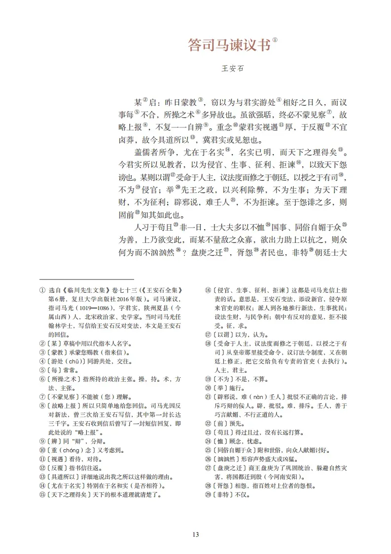 某启:昨日蒙教,窃以为与君实游处相好之日久,而议事每不合,所操之术多异故也。虽欲强聒,终必不蒙见察,故略上报,不复一自辨。重念蒙君实视遇厚,于反复不宜卤莽,故今具道所以,冀君实或见恕也。盖儒者所争,尤在名实,名实已明,而天下之理得矣。今君实所以见教者,以为侵官、生事、征利、拒谏,以致天下怨谤也。某则以为受命于人主,议法度而修之于朝廷,以授之于有司,不为侵官;举先王之政,以兴利除弊,不为生事;为天下理财,不为征利;辟邪说,难壬人,不为拒谏。至于怨诽之多,则固前知其如此也。人习于苟且非一日,士大夫多以不恤国事、同俗自媚于众为善,上乃欲变此,而某不量敌之众寡,欲出力助上以抗之,则众何为而不汹汹然?盘庚之迁,胥怨者民也,非特朝廷士大夫而已。盘庚不为怨者故改其度,度义而后动,是而不见可悔故也。如君实责我以在位久,未能助上大有为,以膏泽斯民,则某知罪矣;如曰今日当一切不事事,守前所为而已,则非某之所敢知。无由会晤,不任区区向往之至。