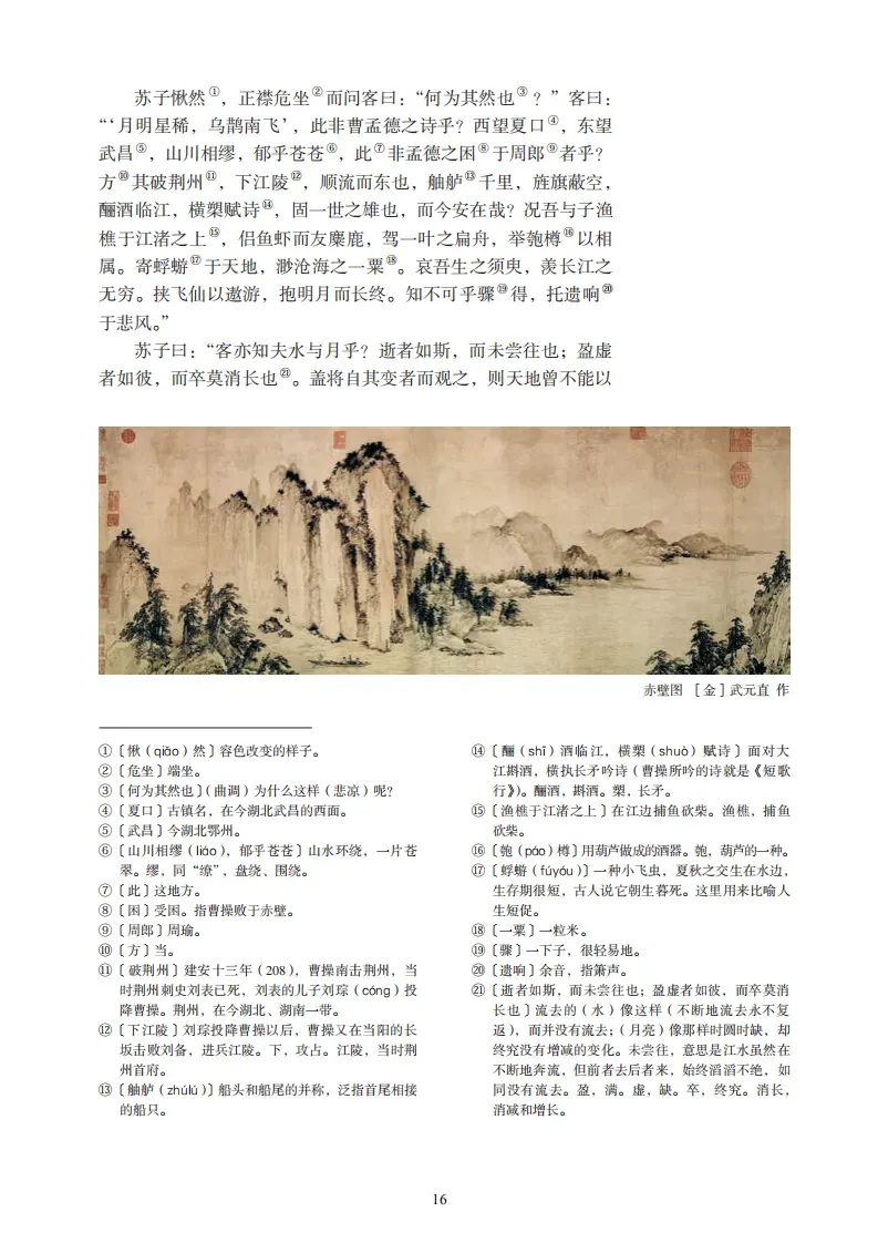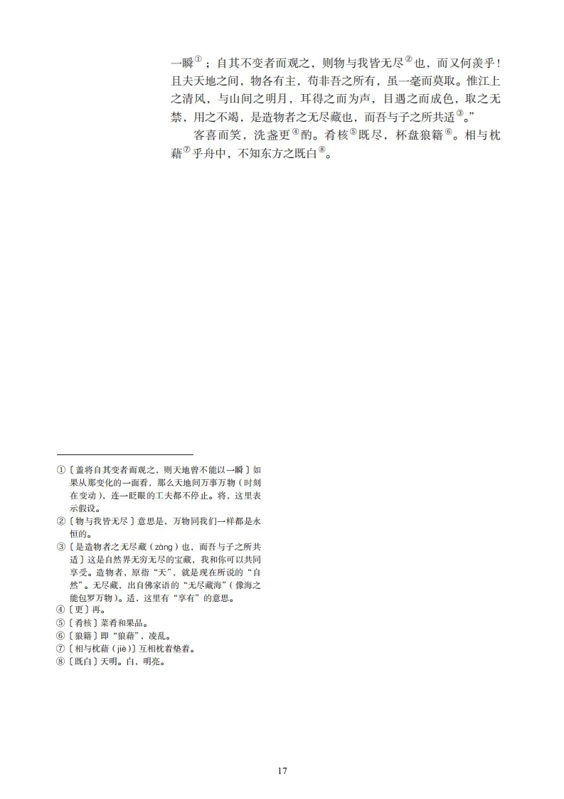 壬戌之秋,七月既望,苏子与客泛舟游于赤壁之下。清风徐来,水波不兴。举酒属客,诵明月之诗,歌窈窕之章。少焉,月出于东山之上,徘徊于斗牛之间。白露横江,水光接天。纵一苇之所如,凌万顷之茫然。浩浩乎如冯虚御风,而不知其所止;飘飘乎如遗世独立,羽化而登仙。于是饮酒乐甚,扣舷而歌之。歌曰:“桂棹兮兰桨,击空明兮溯流光。渺渺兮予怀,望美人兮天一方。”客有吹洞箫者,倚歌而和之。其声呜呜然,如怨如慕,如泣如诉,余音袅袅,不绝如缕。舞幽壑之潜蛟,泣孤舟之嫠妇。苏子愀然,正襟危坐而问客曰:“何为其然也?”客曰:“‘月明星稀,乌鹊南飞’,此非曹孟德之诗乎?西望夏口,东望武昌,山川相缪,郁乎苍苍,此非孟德之困于周郎者乎?方其破荆州,下江陵,顺流而东也,舳舻千里,旌旗蔽空,酾酒临江,横槊赋诗,固一世之雄也,而今安在哉?况吾与子渔樵于江渚之上,侣鱼虾而友麋鹿,驾一叶之扁舟,举匏樽以相属。寄蜉蝣于天地,渺沧海之一粟。哀吾生之须臾,羡长江之无穷。挟飞仙以遨游,抱明月而长终。知不可乎骤得,托遗响于悲风。”苏子曰:“客亦知夫水与月乎?逝者如斯,而未尝往也;盈虚者如彼,而卒莫消长也。盖将自其变者而观之,则天地曾不能以一瞬;自其不变者而观之,则物与我皆无尽也,而又何羡乎!且夫天地之间,物各有主,苟非吾之所有,虽一毫而莫取。惟江上之清风,与山间之明月,耳得之而为声,目遇之而成色,取之无禁,用之不竭,是造物者之无尽藏也,而吾与子之所共适。”客喜而笑,洗盏更酌。肴核既尽,杯盘狼籍。相与枕藉乎舟中,不知东方之既白。