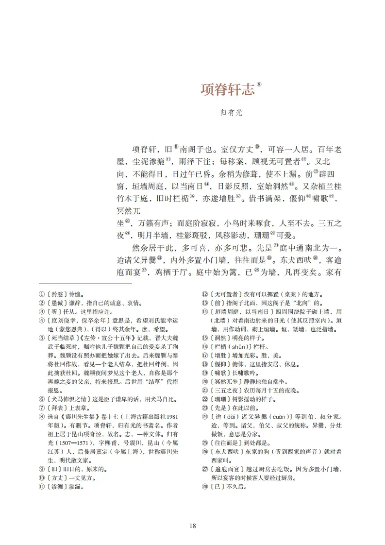 项脊轩,旧南阁子也。室仅方丈,可容一人居。百年老屋,尘泥渗漉,雨泽下注;每移案,顾视,无可置者。又北向,不能得日,日过午已昏。余稍为修葺,使不上漏。前辟四窗,垣墙周庭,以当南日,日影反照,室始洞然。又杂植兰桂竹木于庭,旧时栏楯,亦遂增胜。借书满架,偃仰啸歌,冥然兀坐,万籁有声;而庭堦寂寂,小鸟时来啄食,人至不去。三五之夜,明月半墙,桂影斑驳,风移影动,珊珊可爱。然余居于此,多可喜,亦多可悲。先是庭中通南北为一。迨诸父异爨,内外多置小门,墙往往而是。东犬西吠,客逾庖而宴,鸡栖于厅。庭中始为篱,已为墙,凡再变矣。家有老妪,尝居于此。妪,先大母婢也,乳二世,先妣抚之甚厚。室西连于中闺,先妣尝一至。妪每谓余曰:”某所,而母立于兹。”妪又曰:”汝姊在吾怀,呱呱而泣;娘以指叩门扉曰:‘儿寒乎?欲食乎?’吾从板外相为应答。”语未毕,余泣,妪亦泣。余自束发,读书轩中,一日,大母过余曰:”吾儿,久不见若影,何竟日默默在此,大类女郎也?”比去,以手阖门,自语曰:”吾家读书久不效,儿之成,则可待乎!”顷之,持一象笏至,曰:”此吾祖太常公宣德间执此以朝,他日汝当用之!”瞻顾遗迹,如在昨日,令人长号不自禁。轩东,故尝为厨,人往,从轩前过。余扃牖而居,久之,能以足音辨人。轩凡四遭火,得不焚,殆有神护者。项脊生曰:”蜀清守丹穴,利甲天下,其后秦皇帝筑女怀清台;刘玄德与曹操争天下,诸葛孔明起陇中。方二人之昧昧于一隅也,世何足以知之,余区区处败屋中,方扬眉、瞬目,谓有奇景。人知之者,其谓与坎井之蛙何异?”余既为此志,后五年,吾妻来归,时至轩中,从余问古事,或凭几学书。吾妻归宁,述诸小妹语曰:”闻姊家有阁子,且何谓阁子也?”其后六年,吾妻死,室坏不修。其后二年,余久卧病无聊,乃使人复葺南阁子,其制稍异于前。然自后余多在外,不常居。庭有枇杷树,吾妻死之年所手植也,今已亭亭如盖矣。